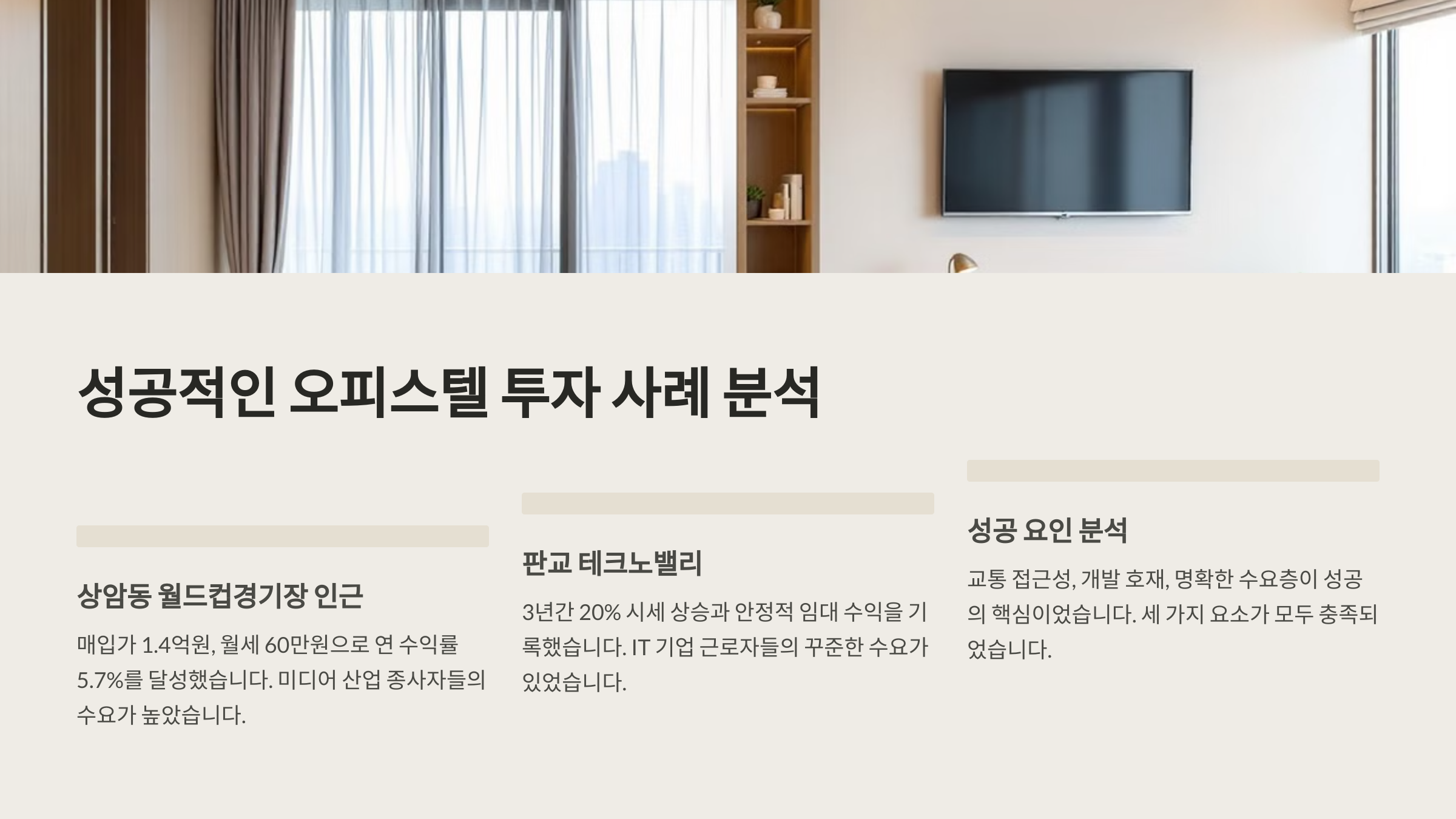 성공적인 투자 사례 분석 실제 사례를 통해 오피스텔 투자 수익률을 알아보면 더 실감 나요. 서울 강남구 역삼동에 위치한 한 오피스텔은 2020년 2억 5천만 원에 매입되어 현재 3억 원에 매각되었고, 매입 기간 동안 월 90만 원의 임대수익도 얻었어요.