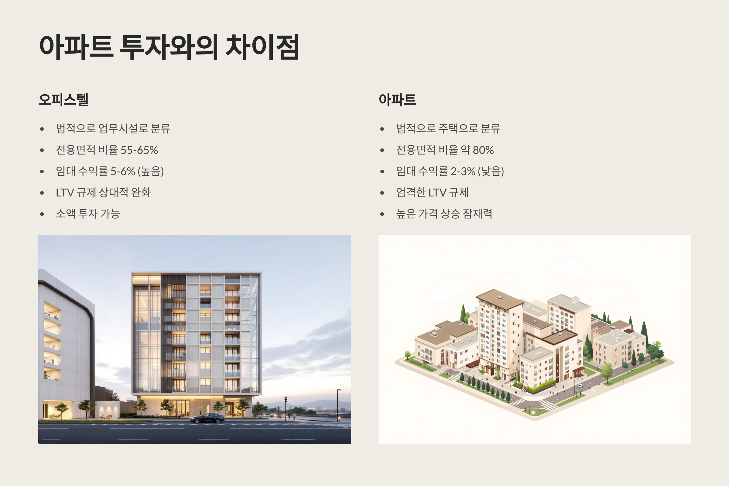 많은 사람들이 오피스텔과 아파트 투자를 고민하면서 "뭐가 더 나을까?" 하고 비교하게 돼요. 사실 두 상품은 구조적으로 완전히 다른 시장이에요. 오피스텔은 월세 수익 중심, 아파트는 시세차익 중심이라는 게 가장 큰 차이에요.아파트는 대출, 청약, 양도세 규제 등에서 민감하게 반응하는 상품이고, 실수요자의 수요가 많아요. 반면, 오피스텔은 규제가 적은 대신 수익률이 낮을 수 있고, 공실 리스크도 존재해요.