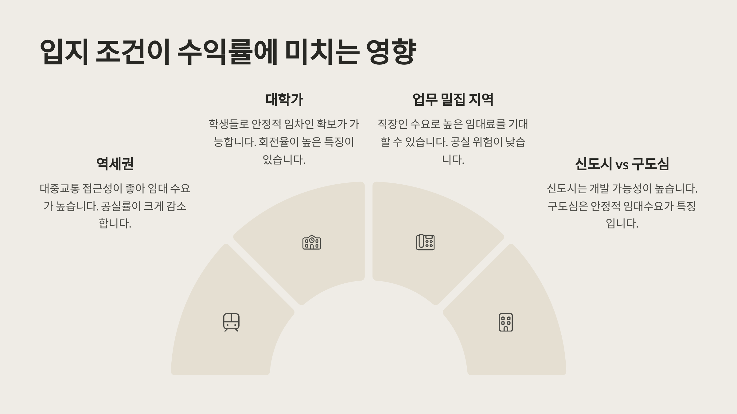 입지 조건이 수익률에 미치는 영향 오피스텔은 ‘어디에 있느냐’가 수익률의 절반을 결정한다고 해도 과언이 아니에요. 특히 직장 밀집 지역, 대학가, 병원 주변처럼 고정적인 수요층이 있는 입지는 월세 수익뿐만 아니라 향후 매각 시점의 시세 차익에도 영향을 줘요.