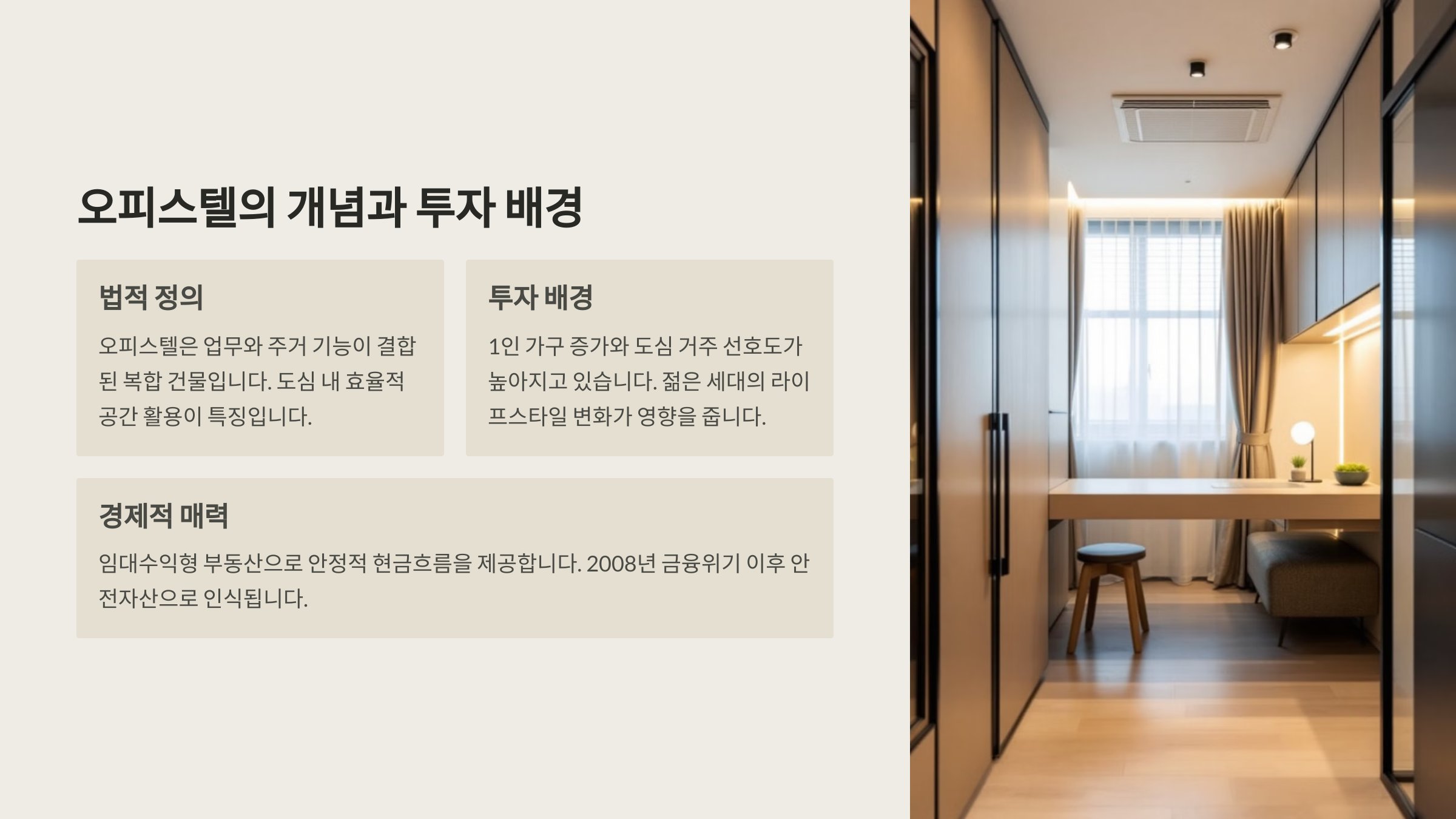 오피스텔은 업무와 주거 기능을 모두 갖춘 부동산 상품으로, 투자자에게 안정적인 월세 수익과 상대적으로 낮은 진입장벽을 제공하는 게 장점이에요. 특히 1~2인 가구 증가와 유동 인구가 많은 도심에서 수요가 꾸준하다는 점에서 많은 사람들이 주목하고 있죠.