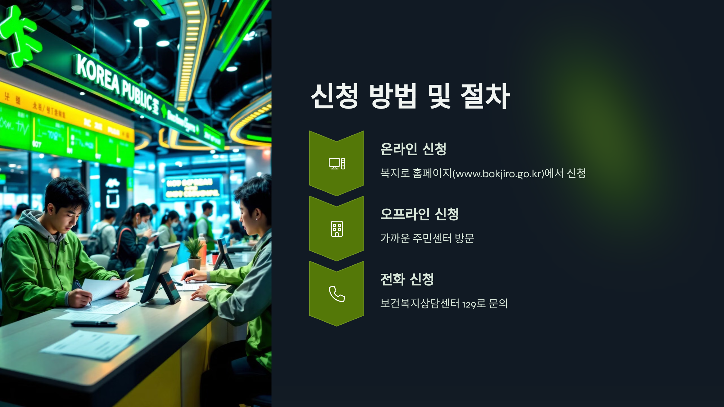 대부분의 경우 주민센터(행정복지센터)를 통해 신청하며, 각 시·군·구청에서도 신청 접수를 도와주는 창구를 운영하고 있어요. 전화 문의나 온라인 사전 예약도 가능하니, 거주 지역에 맞는 신청 방법을 잘 살펴보면 좋아요.