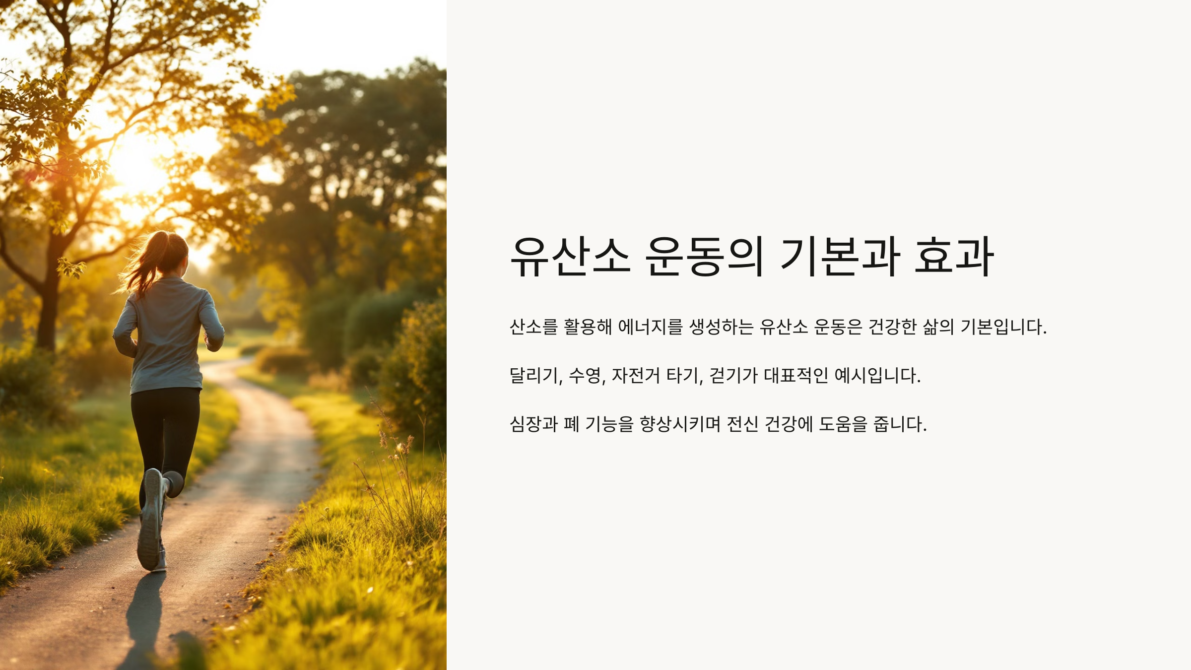 유산소 운동이란 말 그대로 산소를 사용하는 운동이에요. 우리 몸이 산소를 이용해 에너지를 만들어내며 장시간 지속할 수 있는 움직임을 뜻하죠. 대표적으로 걷기, 뛰기, 자전거 타기, 수영 등이 있어요. 이러한 운동은 일정한 강도로 오랜 시간 동안 지속할 수 있어야 해요.