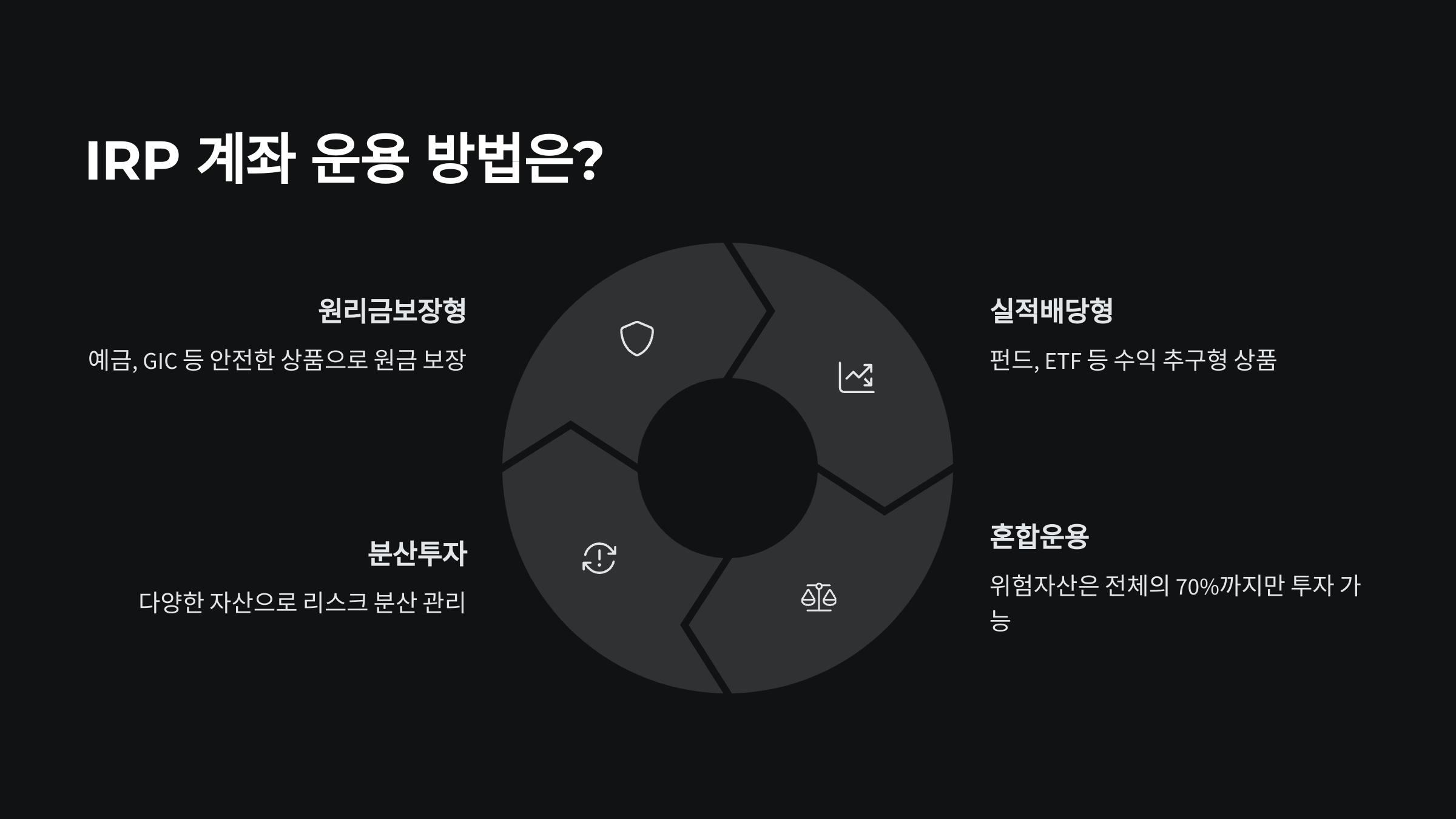 IRP 계좌를 만들었다면 이제 중요한 건 ‘어떻게 운용하느냐’예요. 단순히 예금에만 넣어두는 건 물가 상승률을 감안할 때 자산이 제자리걸음을 걷는 것과 다를 게 없어요. IRP는 다양한 자산에 분산 투자할 수 있기 때문에, 제대로 운용하면 수익도 챙기고 절세 효과도 극대화할 수 있답니다.
