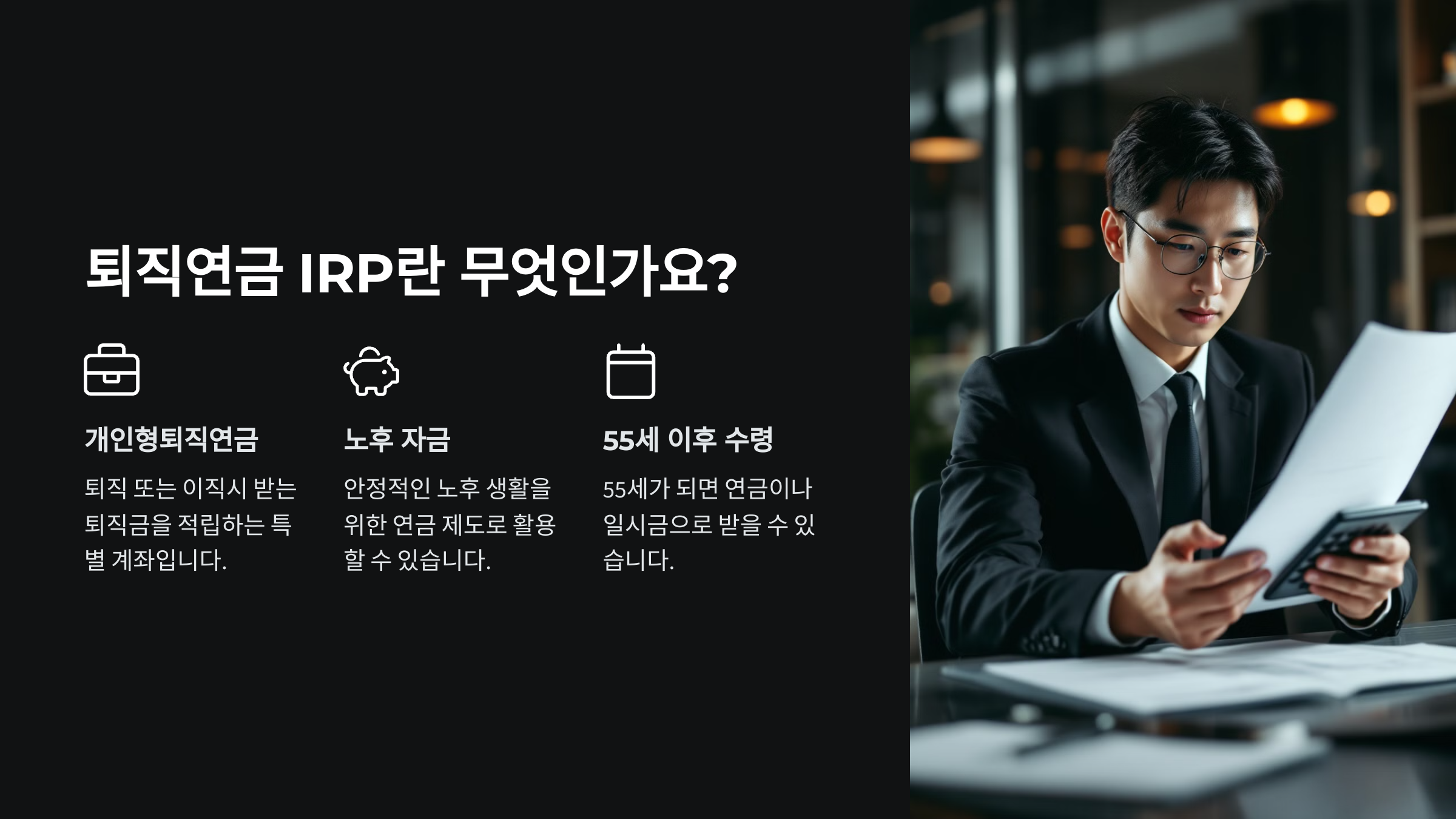 IRP는 ‘Individual Retirement Pension’의 줄임말로, 개인형 퇴직연금 계좌를 의미해요. 기존 직장에서 퇴직금을 받거나, 자영업자나 프리랜서가 노후 대비를 위해 직접 가입할 수 있는 제도랍니다. 특히 최근엔 세액공제 혜택 덕분에 직장인뿐 아니라 20~30대도 관심을 많이 가지게 되었죠.