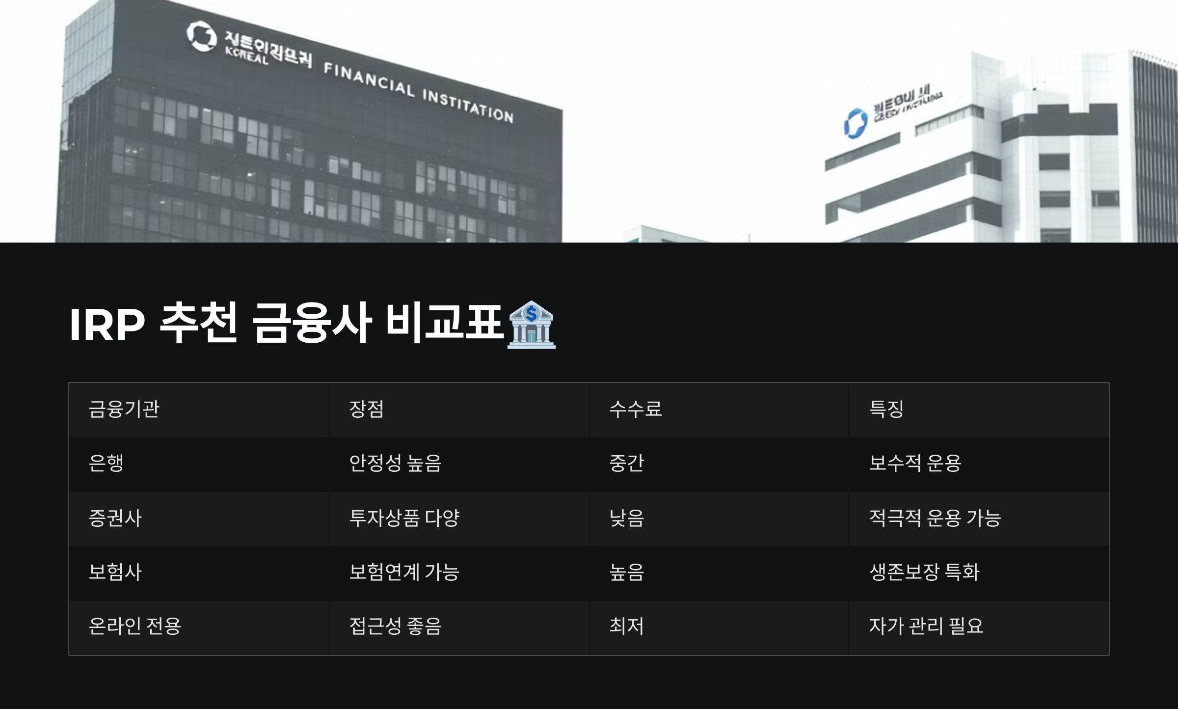 IRP 추천 금융사는 보통 다음 기준으로 비교해요: ① 수수료 ② 모바일앱 편의성 ③ 제공 상품 다양성 ④ 고객 응대 서비스. 아래 비교표에서 각 금융사별 장단점을 체크해볼 수 있어요!