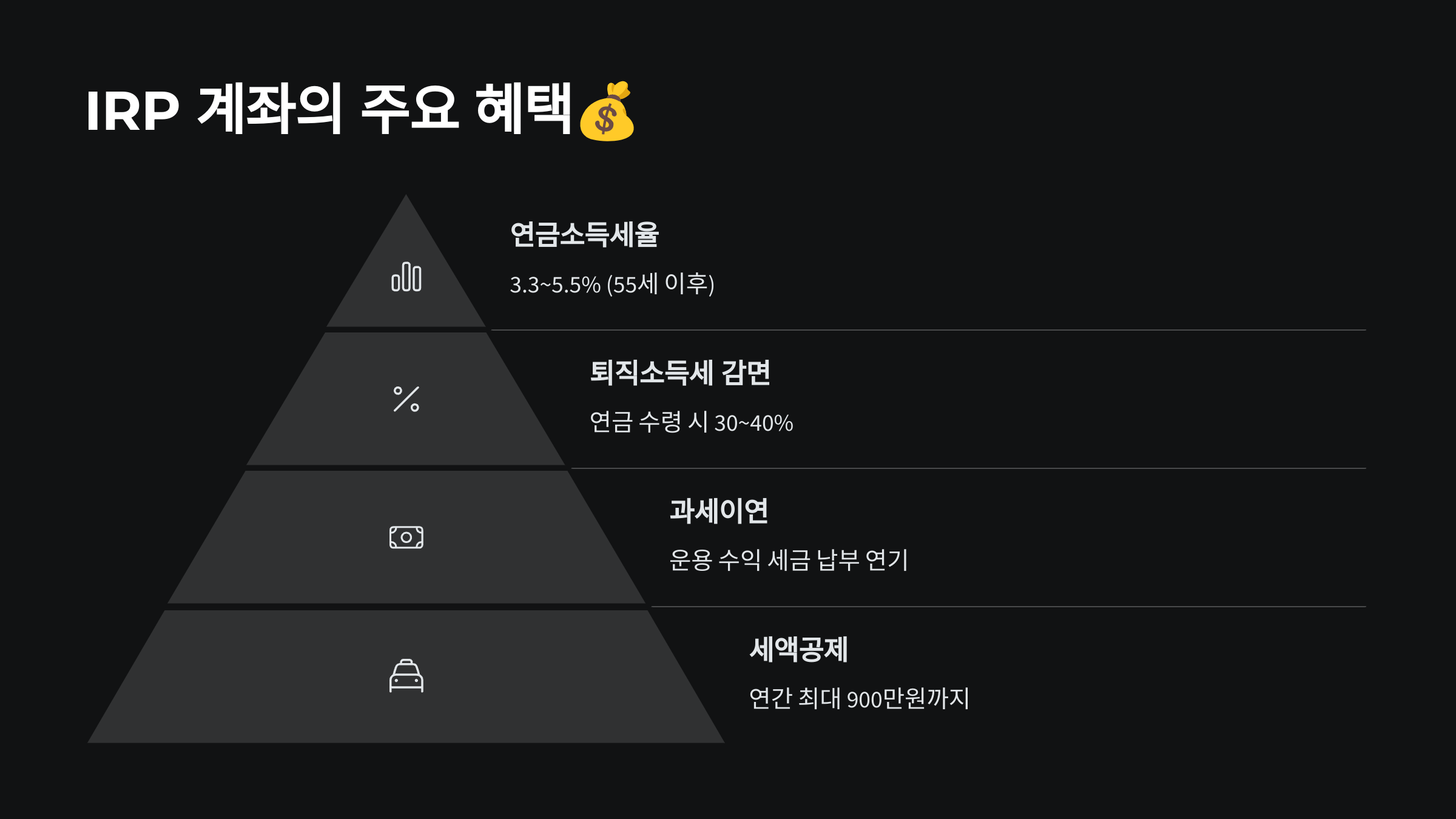 또 하나의 큰 장점은 ‘과세이연’이에요. IRP 계좌에서 발생하는 수익(예금 이자, 펀드 수익 등)은 당장 세금이 부과되지 않고, 55세 이후 연금으로 수령할 때 저율 과세(3.3~5.5%)로 적용돼요. 일반 금융상품과 비교하면 큰 차이를 만들 수 있는 부분이죠.
