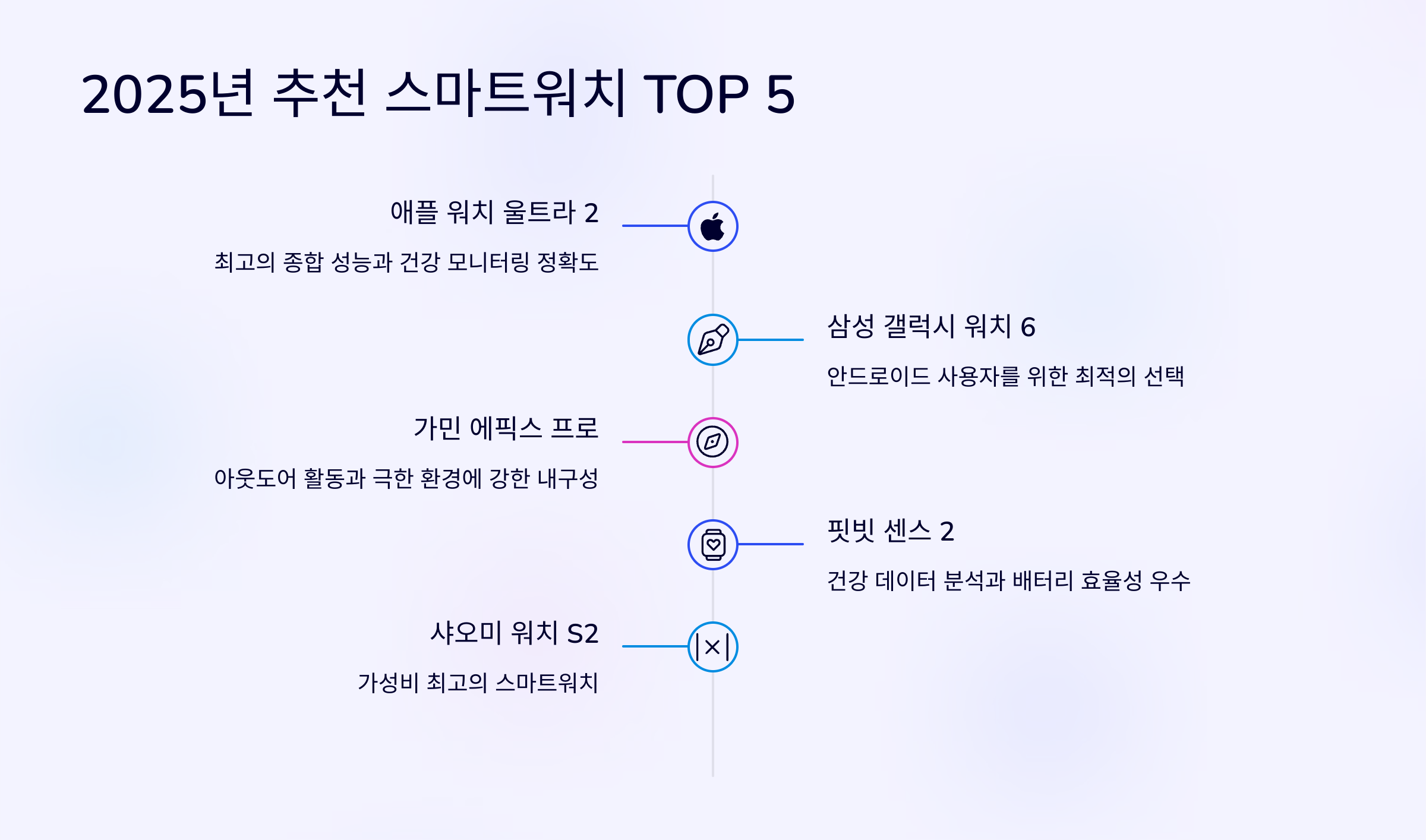 이번 가이드에서는 2025년 기준 최고의 스마트워치 5종과 비교 분석을 통해 여러분에게 딱 맞는 제품을 추천해 드릴게요. 🏃‍♂📊