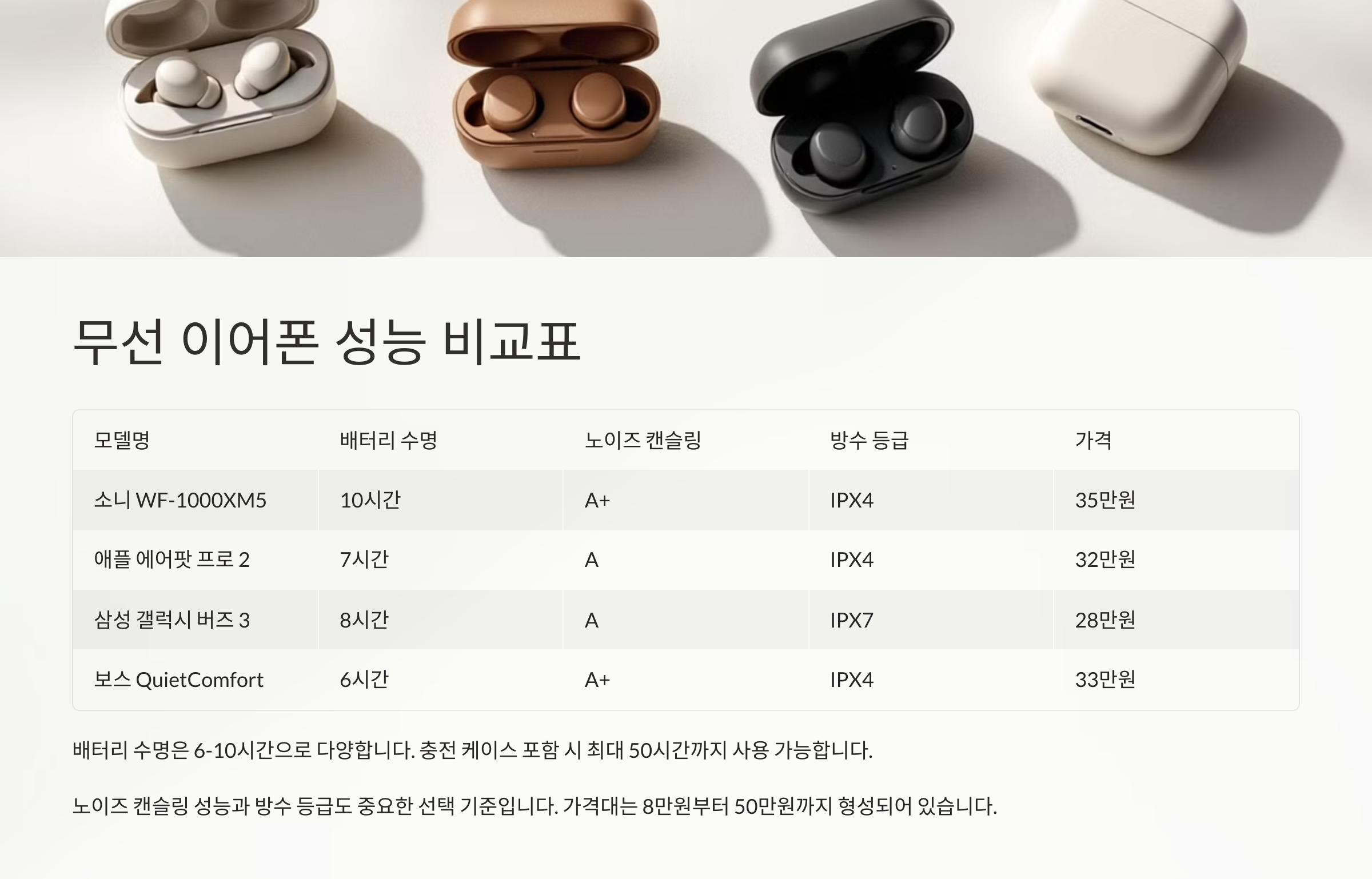 다음으로, 무선 이어폰 성능 비교표를 통해 한눈에 살펴볼까요? 📊