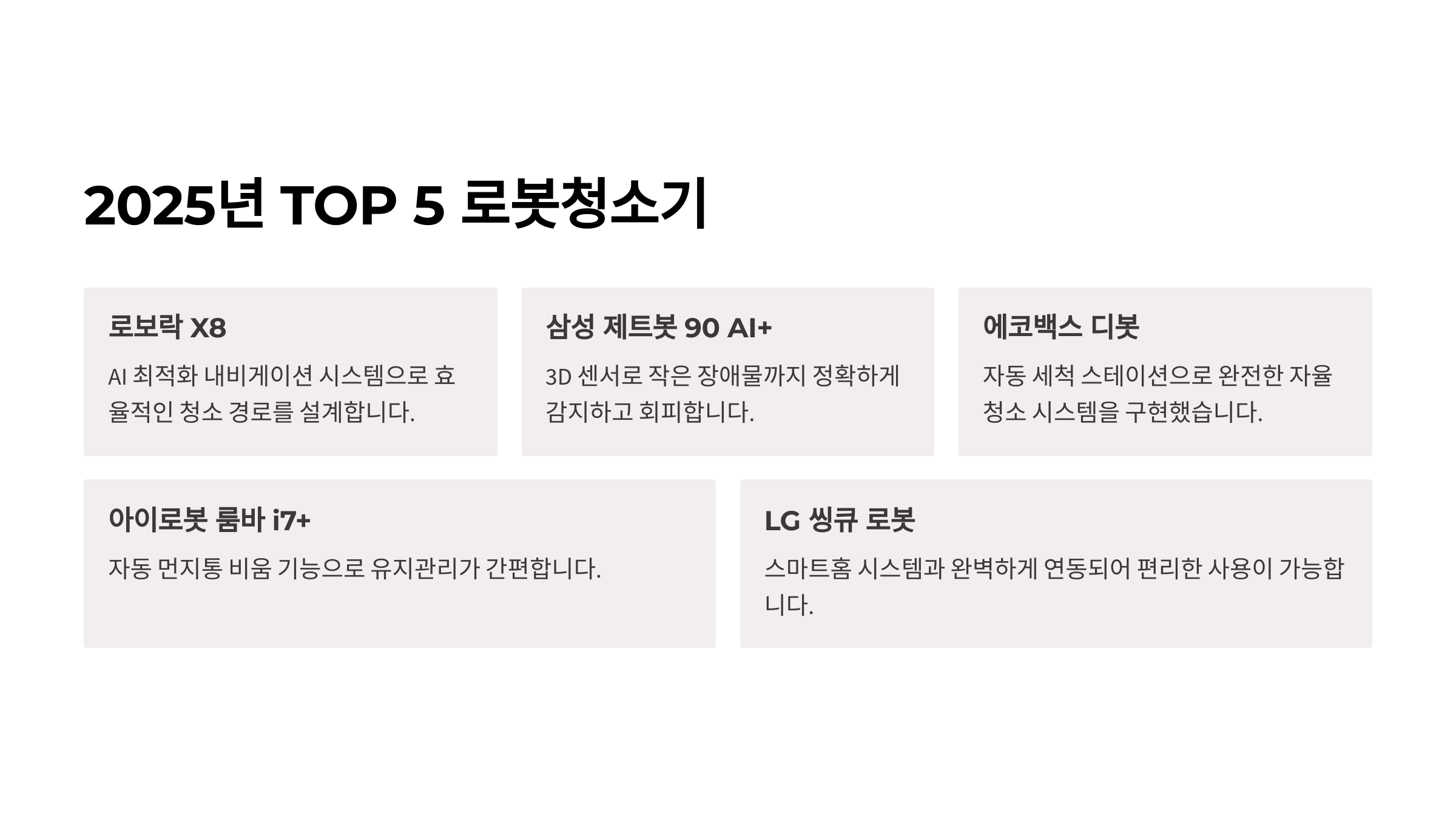 로봇청소기 선택이 고민되시나요? 가성비, 자동 먼지 비움, 흡입력, 스마트 기능까지 한눈에 비교해볼까요? 🤖✨📌 2025년 추천 로봇청소기 비교