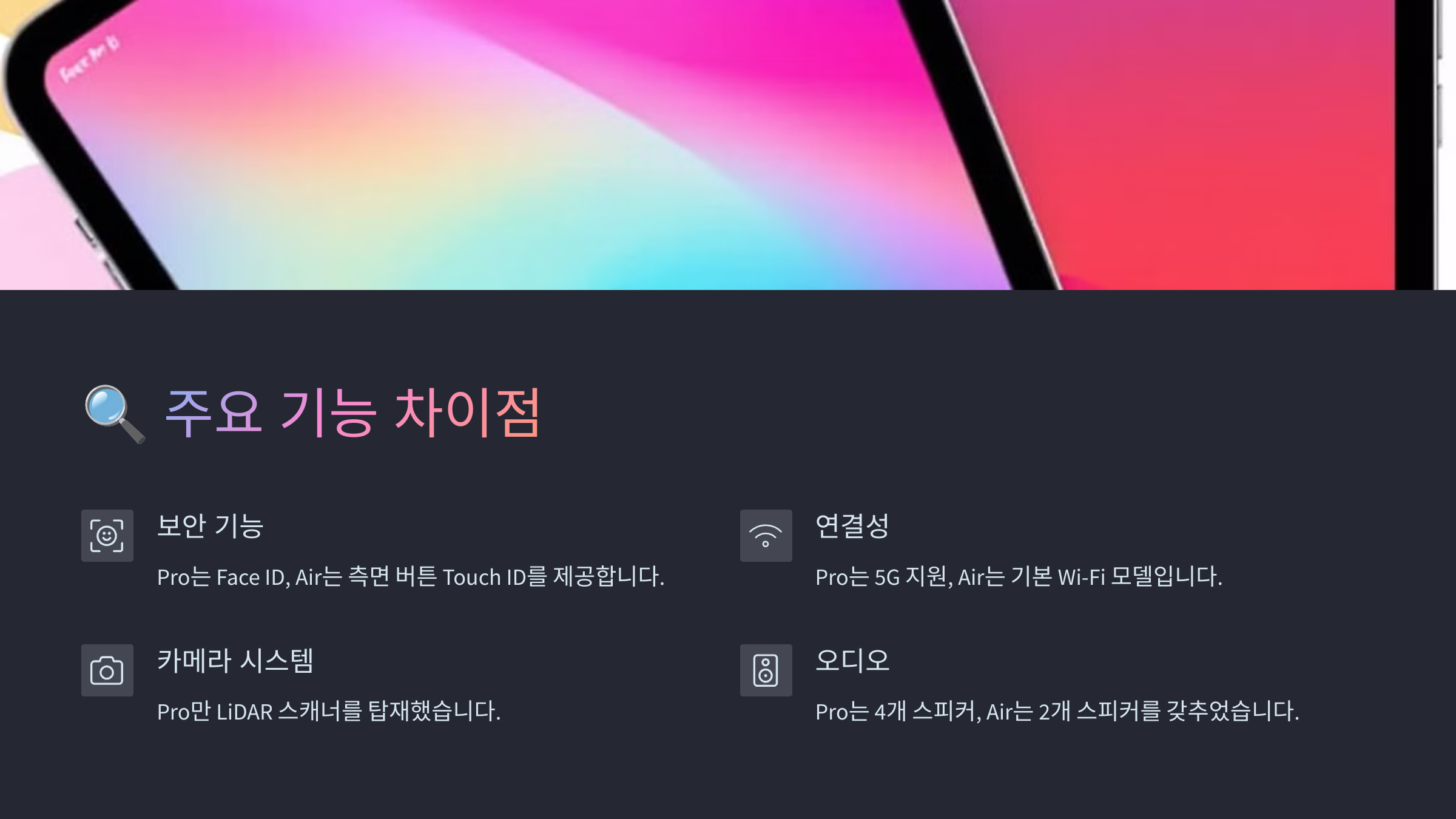 다음으로, 아이패드 프로와 에어의 주요 기능 차이를 비교해볼까요? 🔍