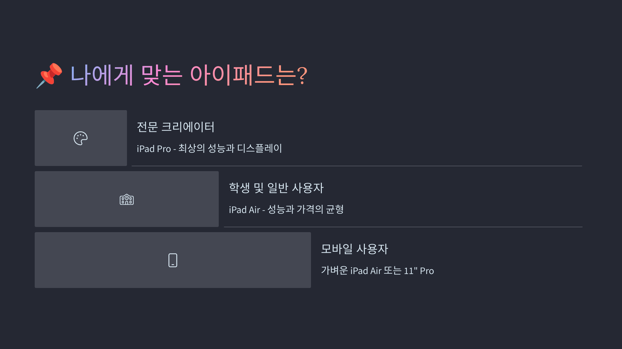 이제, 나에게 맞는 아이패드는 어떤 모델인지 정리해볼까요? 📌