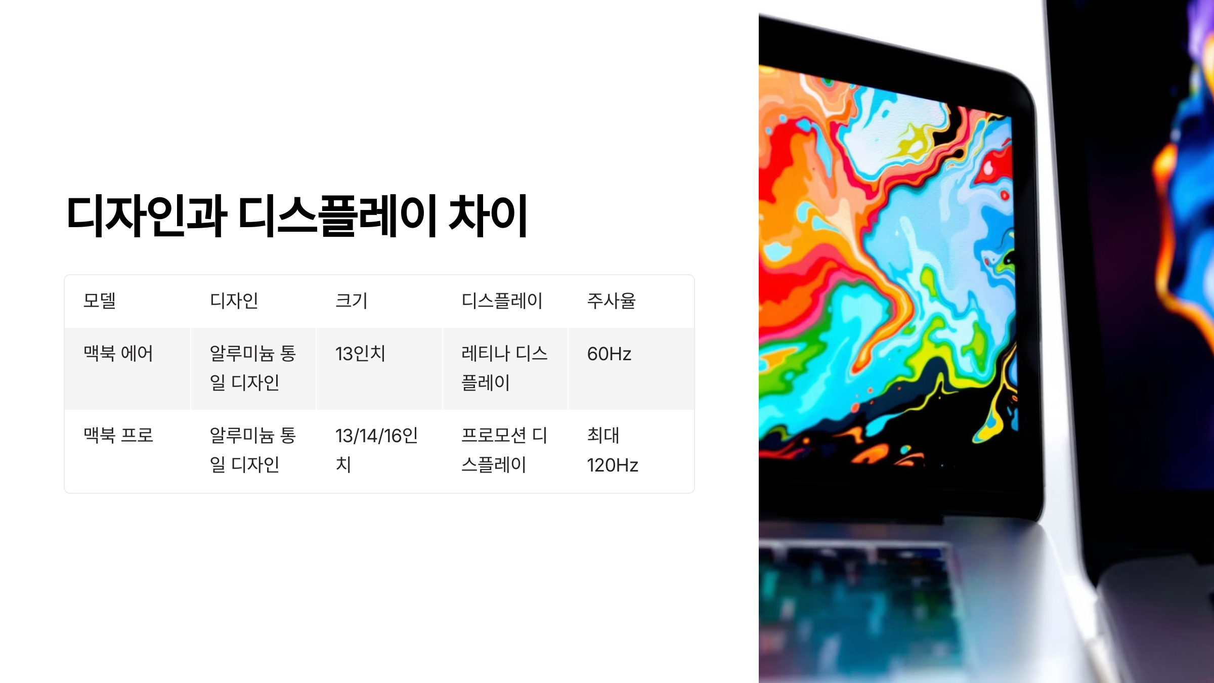 디자인은 사용자의 취향이지만, 화면 품질은 눈이 금방 느끼는 부분이기 때문에 맥북 구매 시 디스플레이 스펙도 꼭 확인하고 고르는 걸 추천해요!