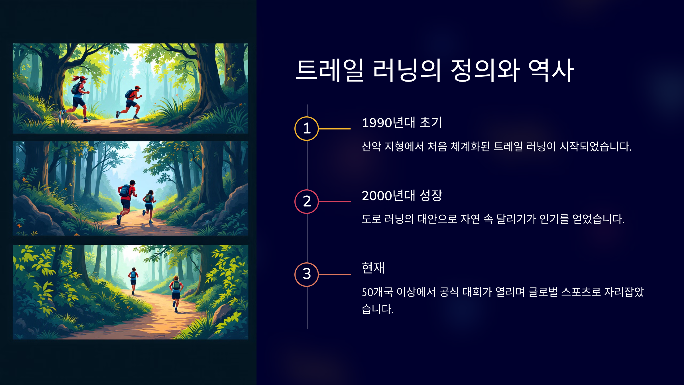 이 운동은 미국과 유럽에서 시작됐어요. 특히 알프스, 록키산맥 등 산악 지역이 많은 국가에서 스포츠로 자리 잡기 시작했죠. 우리나라에서도 최근 몇 년 사이 급속도로 인기를 얻고 있으며, 전국적으로 트레일 러닝 대회도 다양하게 열리고 있어요. 서울 근교 북한산, 도봉산도 인기 코스랍니다.