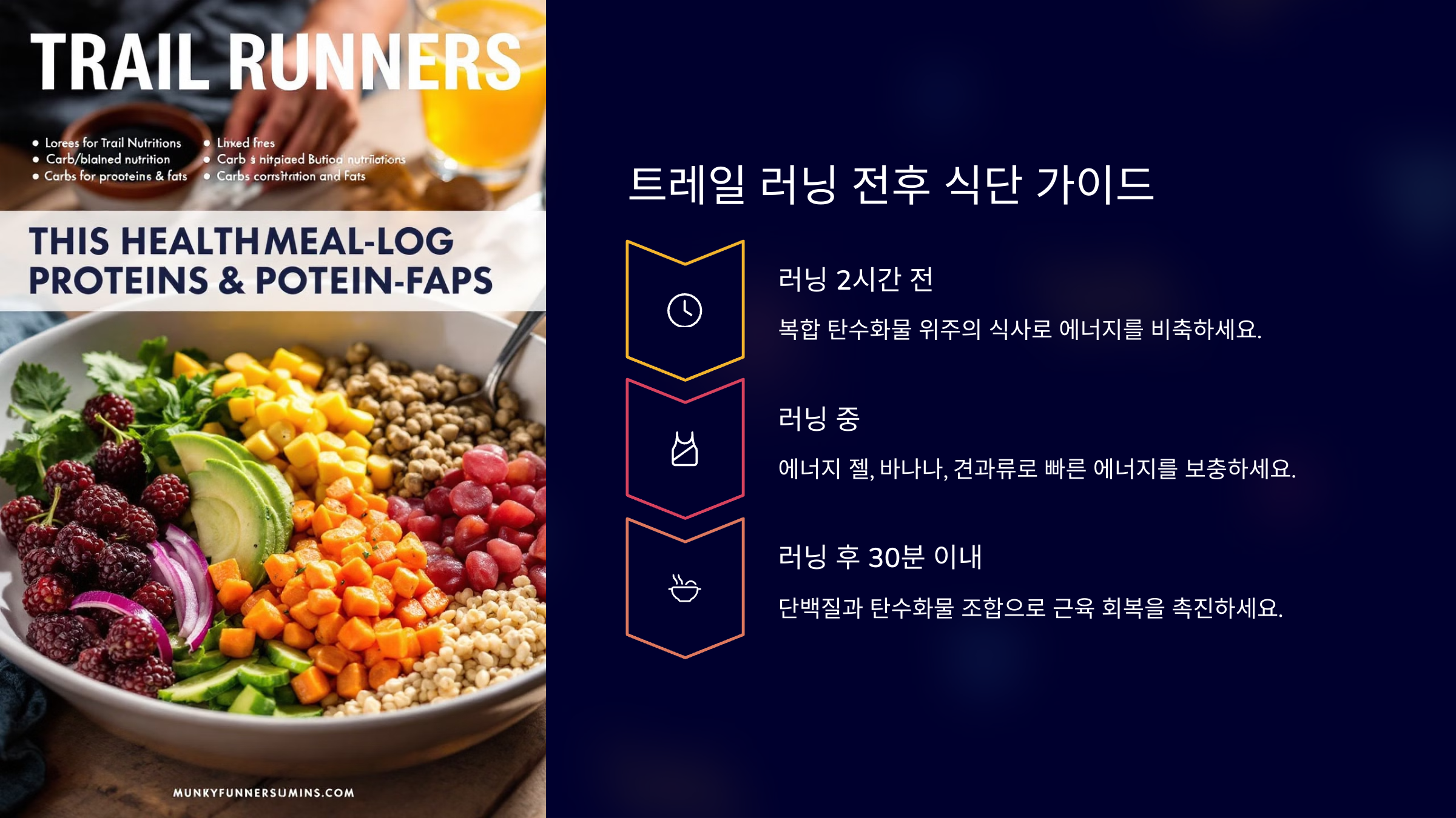 트레일 러닝에서 식단은 성과를 좌우하는 중요한 요소예요. 달리기 전에는 에너지를 충분히 공급하면서도 소화가 잘 되는 음식을 선택하는 게 좋아요. 탄수화물 중심의 가벼운 식사, 예를 들면 바나나와 오트밀, 또는 고구마 한 조각과 닭가슴살이 적당해요. 너무 기름진 음식은 피하는 게 좋아요.