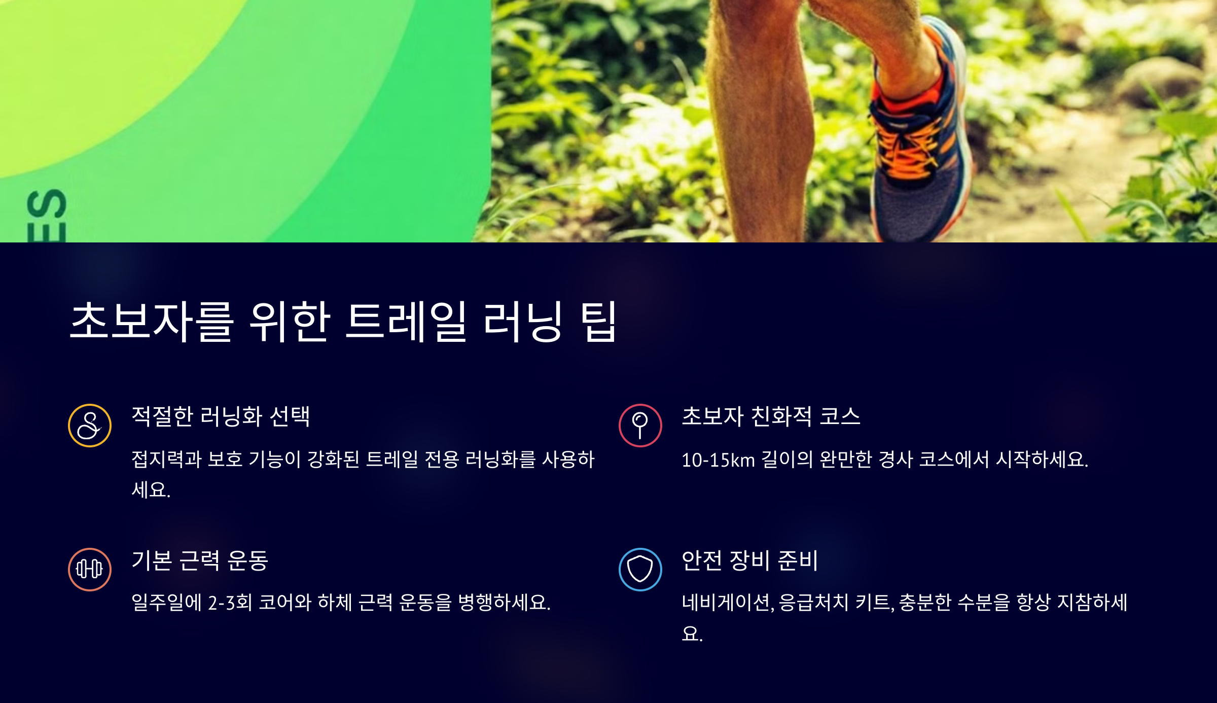신발 선택도 매우 중요해요. 일반 러닝화보다 접지력 좋은 트레일 러닝 전용화를 착용하는 걸 추천해요. 발목 보호를 위해 쿠셔닝도 꼭 확인하고요. 험한 지형을 걷거나 뛰기 때문에 작은 부상이 큰 문제가 될 수 있어요.
