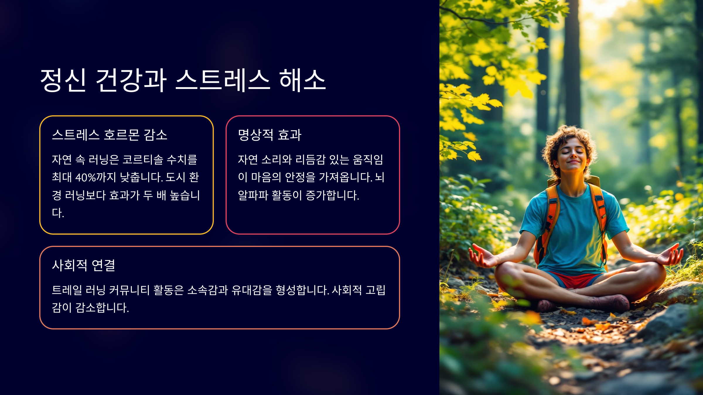 트레일 러닝은 몸뿐만 아니라 마음까지 건강하게 만들어줘요. 숲속을 달리는 동안 맑은 공기와 새소리를 들으면 심장이 안정되고, 머릿속이 맑아지는 걸 느낄 수 있어요. 이는 스트레스 호르몬인 코르티솔 수치를 낮춰주는 효과가 있답니다.