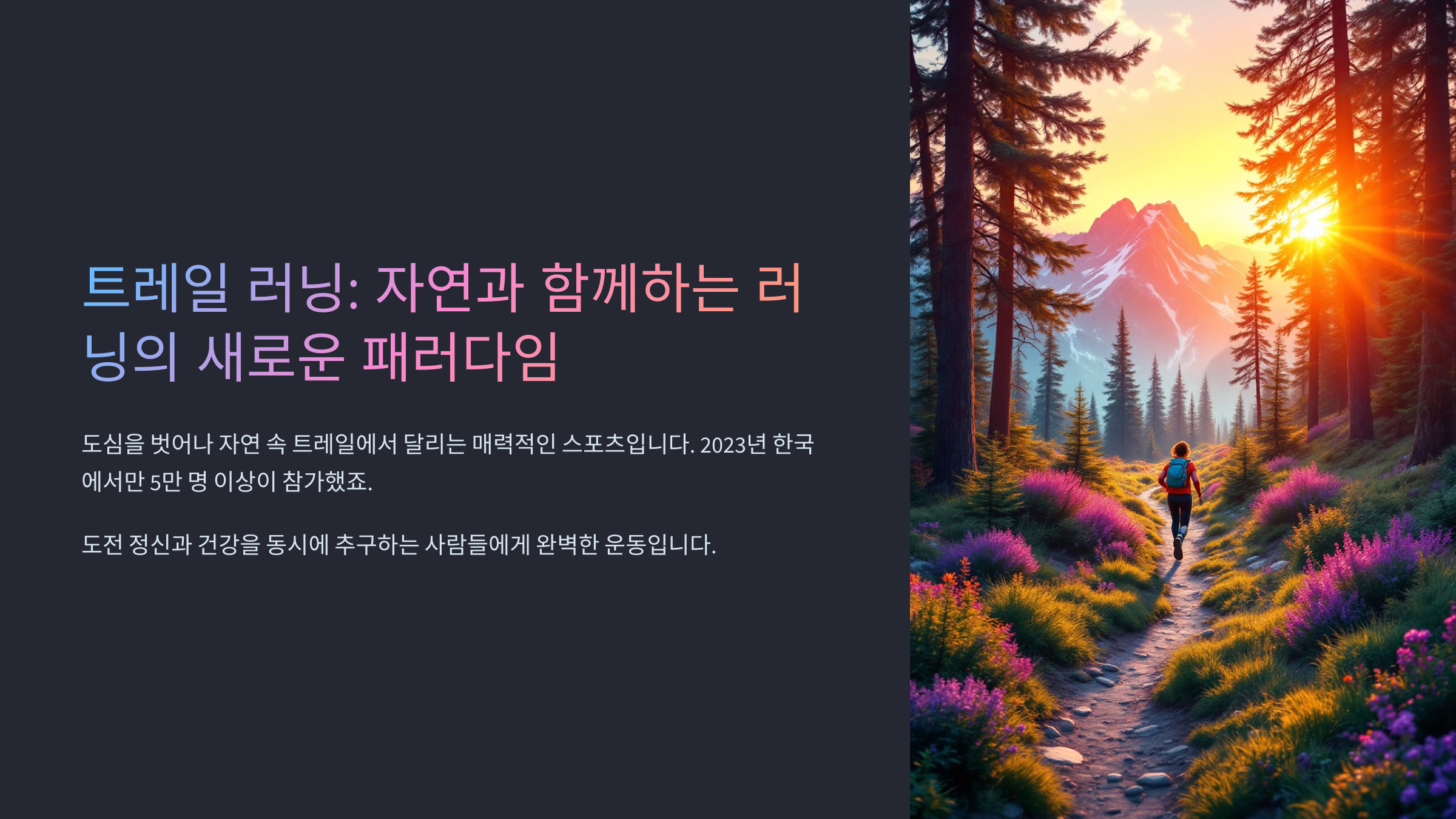 트레일 러닝은 자연 속을 달리는 운동으로, 단순한 조깅과는 전혀 다른 매력을 가진 활동이에요. 숲길, 산길, 흙길 등 고저차가 심한 환경에서 이루어지기 때문에 일반 도로 러닝보다 체력 소모가 훨씬 크고, 그만큼 칼로리 소모도 많아요. 그래서 다이어트와 체력 증진, 정신적 힐링까지 동시에 챙길 수 있는 만능 운동으로 떠오르고 있어요.