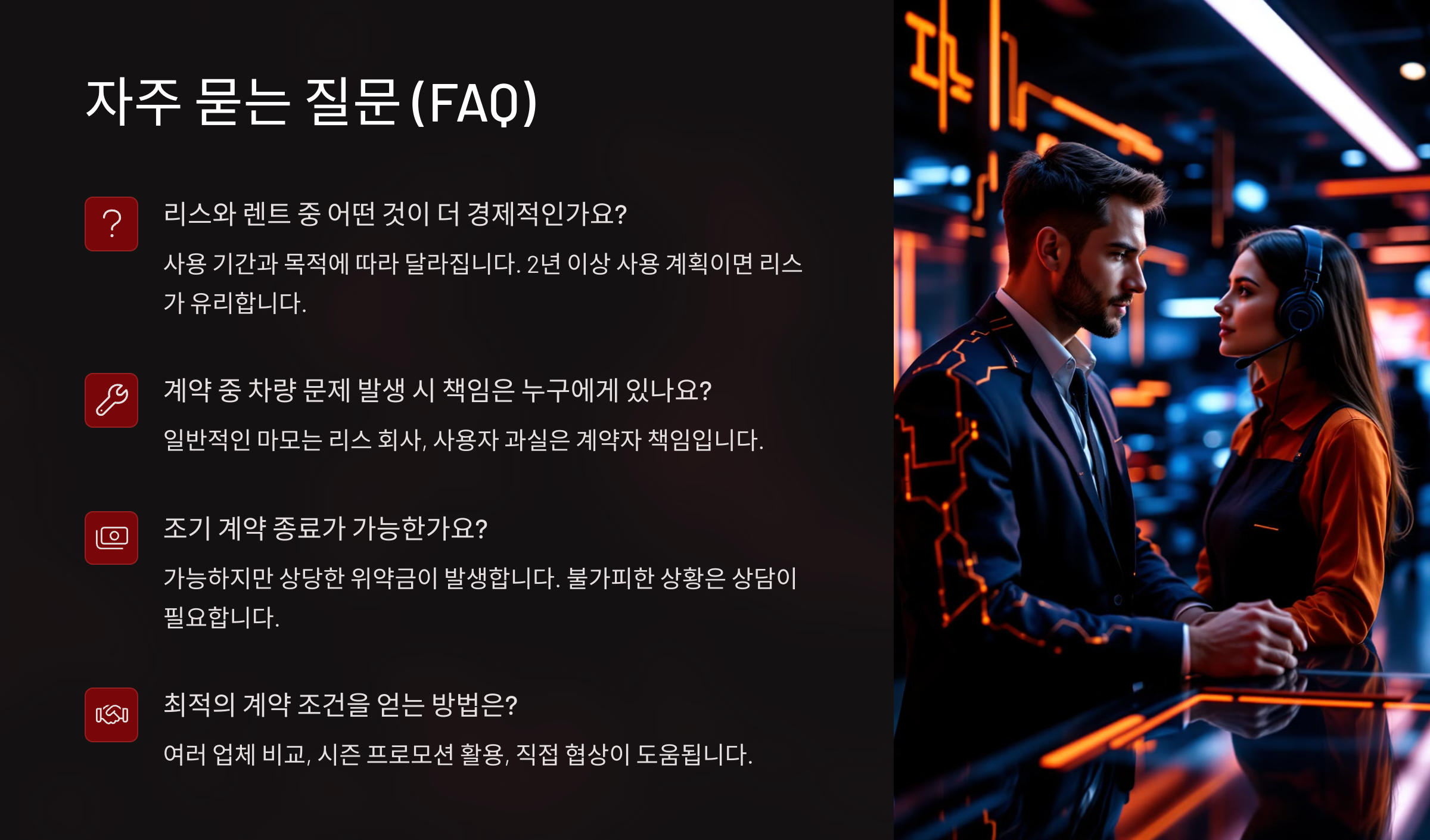 이제 여러분은 실수 없이 깔끔하게 리스 반납할 준비 완료! 다음 마지막 섹션에서는 🚘 FAQ로 자주 묻는 질문과 답변 8가지를 정리해드릴게요 🙋‍♀️