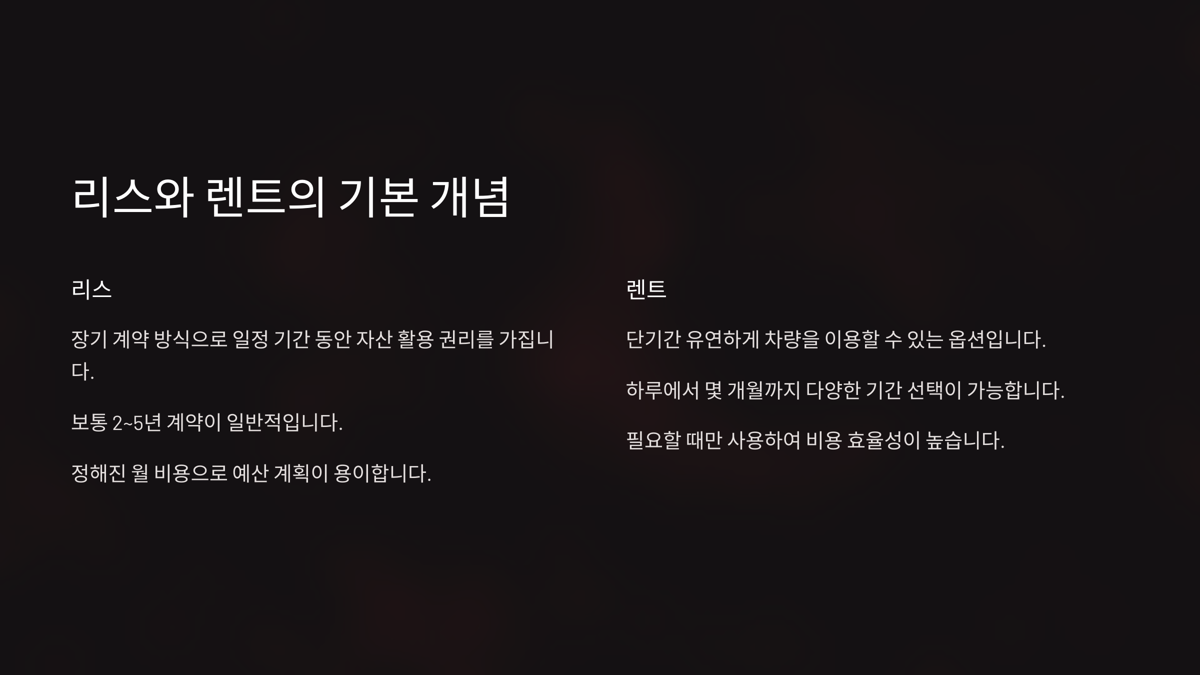 많은 분들이 '리스'와 '렌트'를 같은 개념으로 알고 계시는데요, 실제로는 꽤 큰 차이가 있어요. 리스는 말 그대로 차량을 '빌려서 사용하다가 돌려주는 구조'고, 렌트는 '대여' 개념에 더 가까워요. 둘 다 월 납입금이 발생하지만, 운영 방식과 소유권 구조는 완전히 다르답니다.