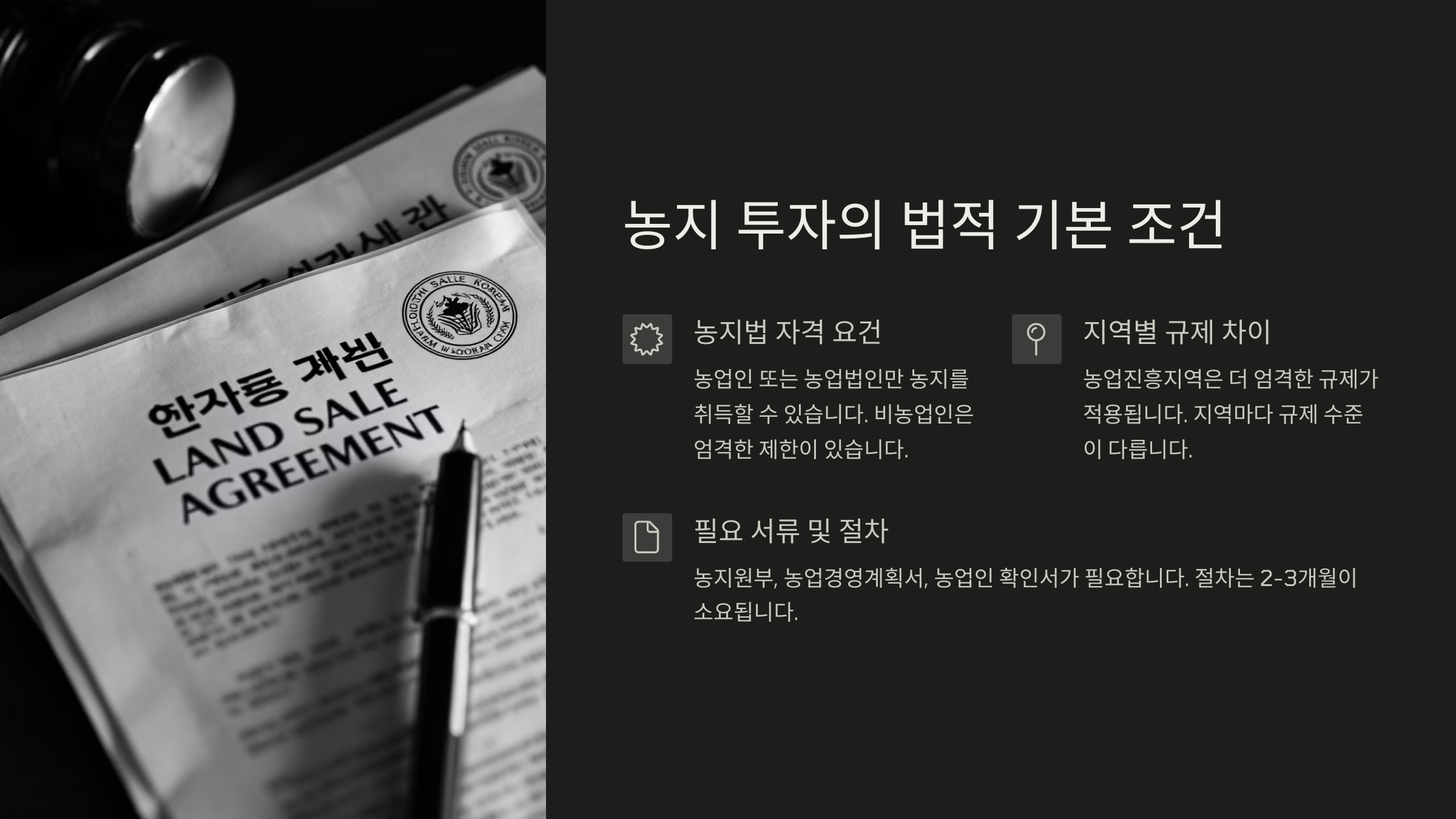 하지만 무턱대고 농지를 매입하면 불법 전용이나 농지법 위반 문제로 곤란해질 수 있어요. 반드시 사전 조건과 법률을 체크하고 투자해야 해요!