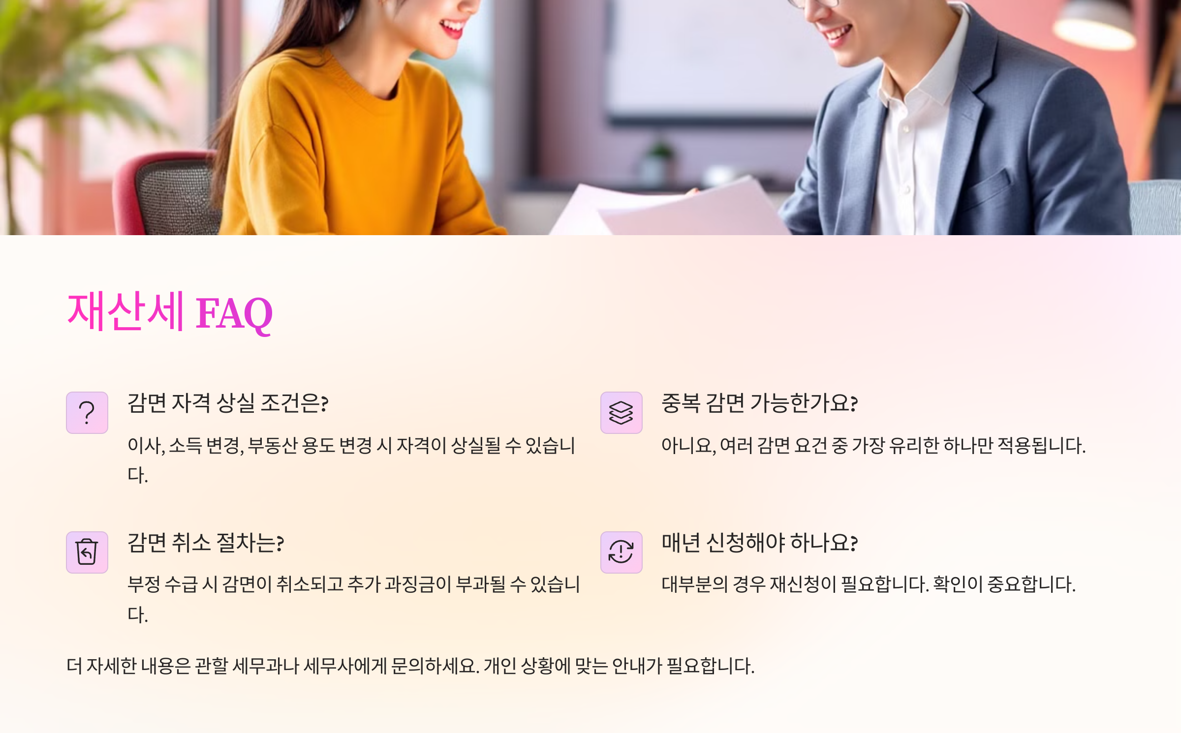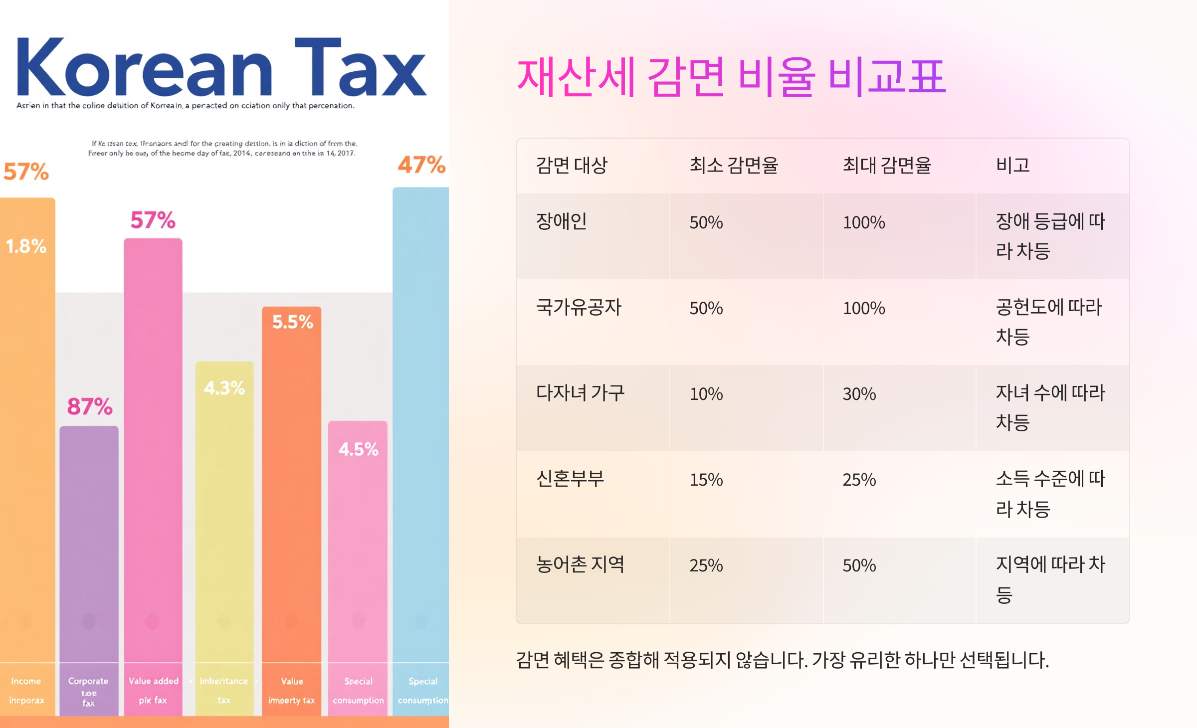 그런데 알고 보면 재산세에도 감면 대상과 감면 비율이 따로 있다는 사실! 특히 고령자, 장애인, 장기보유자, 저가주택 소유자 등은 일부 혹은 전액 감면을 받을 수 있답니다.