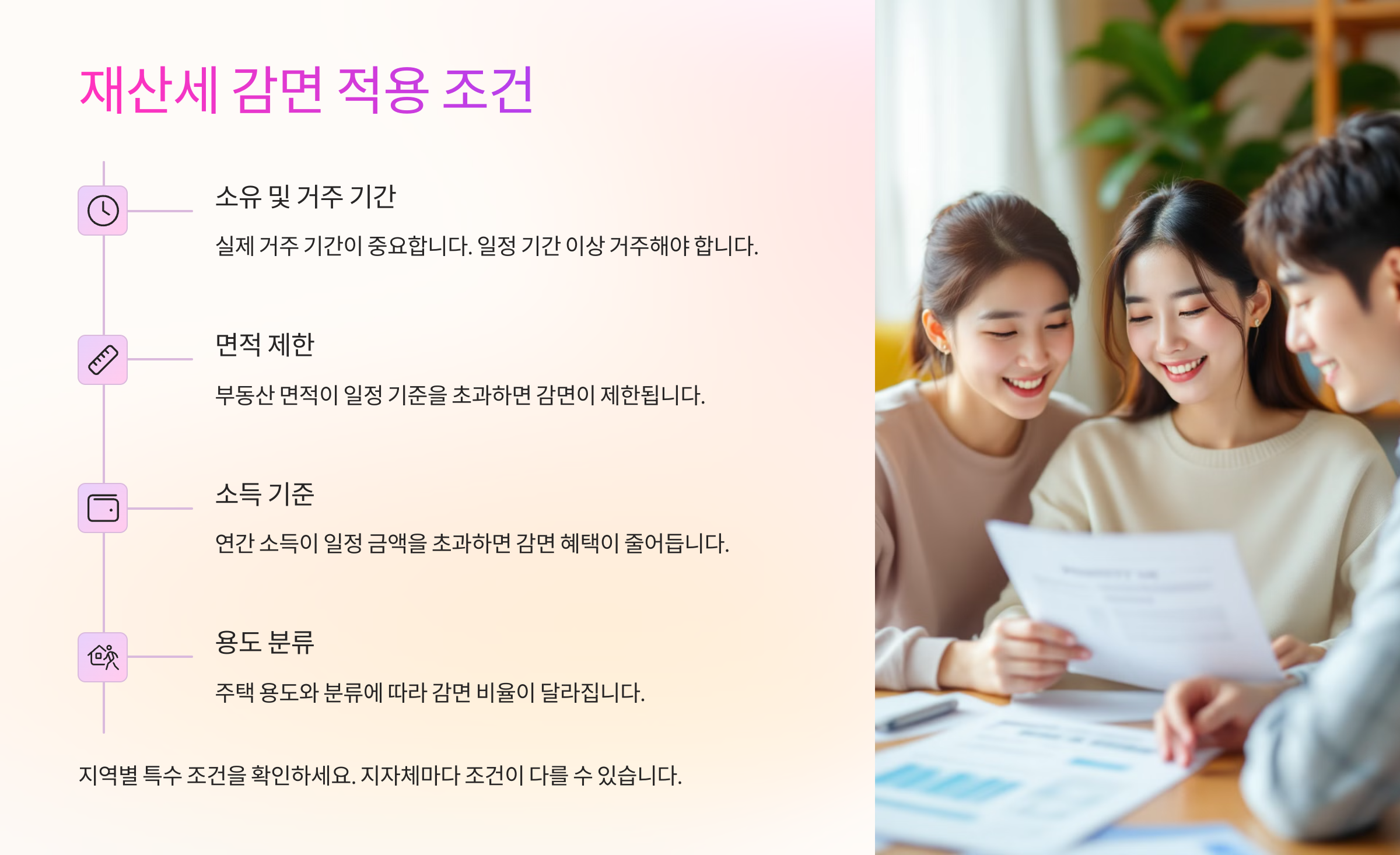 위 조건 중 하나라도 해당된다면 감면 대상일 수 있어요. 하지만 다음 섹션에서 보듯 보유 기간, 거주 요건 등 세부 조건이 꽤 중요하답니다.