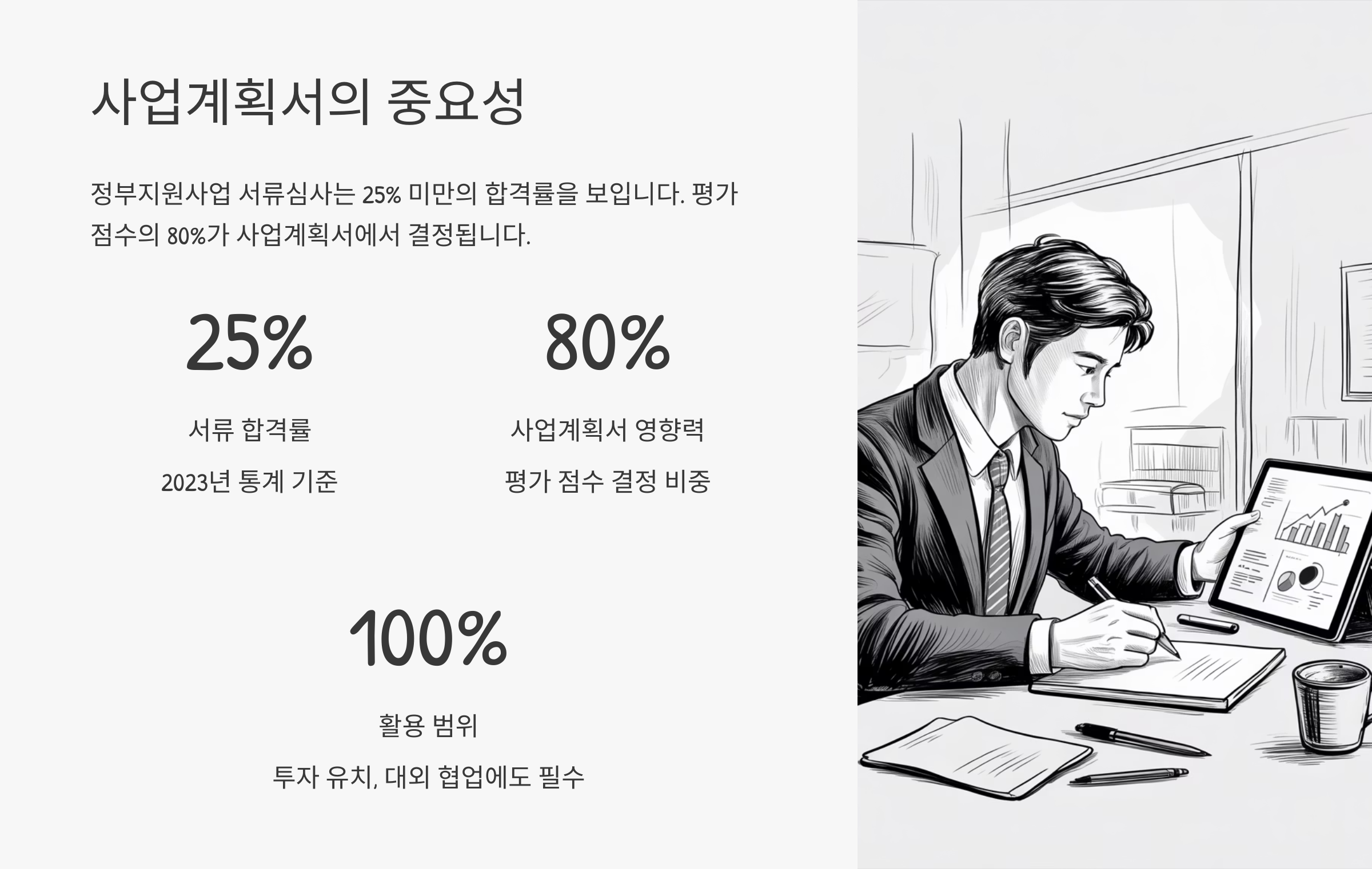 특히 지원 규모가 큰 정부사업일수록 평가위원은 수십에서 수백 개의 계획서를 검토하게 돼요. 이때 핵심 메시지가 명확하고 구성이 잘 짜여진 사업계획서는 눈에 띄게 마련이에요. 짧은 시간 안에 강한 인상을 주는 게 중요하죠.