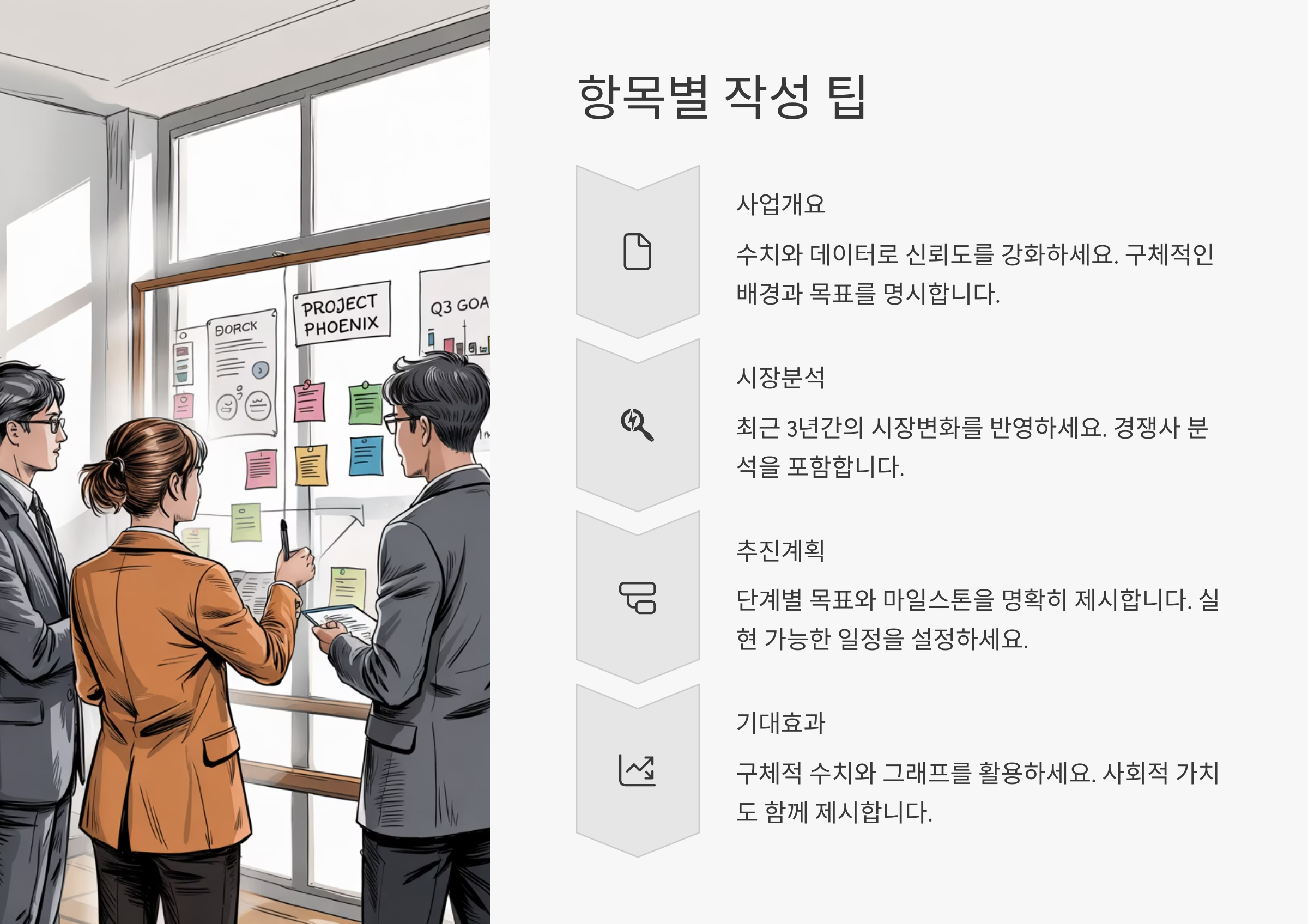 가장 먼저 ‘사업 개요’에서는 사업의 핵심 목적과 추진 배경을 간단명료하게 설명해야 해요. 다음으로는 ‘시장분석’에서 목표 시장의 규모와 성장 가능성, 경쟁사를 분석하고 우리만의 차별점을 강조해야 하죠.