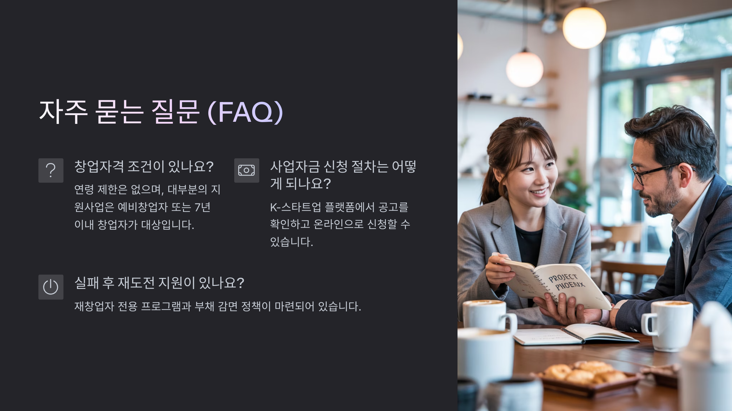 A6. 무상지원금의 경우 실패해도 반환 의무는 없어요. 다만, 자금이 부적절하게 사용됐을 경우 회수 대상이 될 수 있으니 목적에 맞게 사용하는 게 중요해요.
