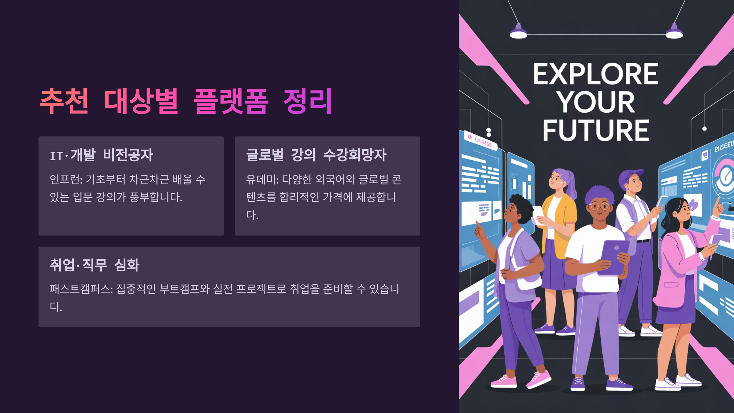 내가 뭘 배우고 싶은지 명확하게 정한 다음, 그에 맞는 플랫폼을 고르는 게 가장 확실한 길이에요!