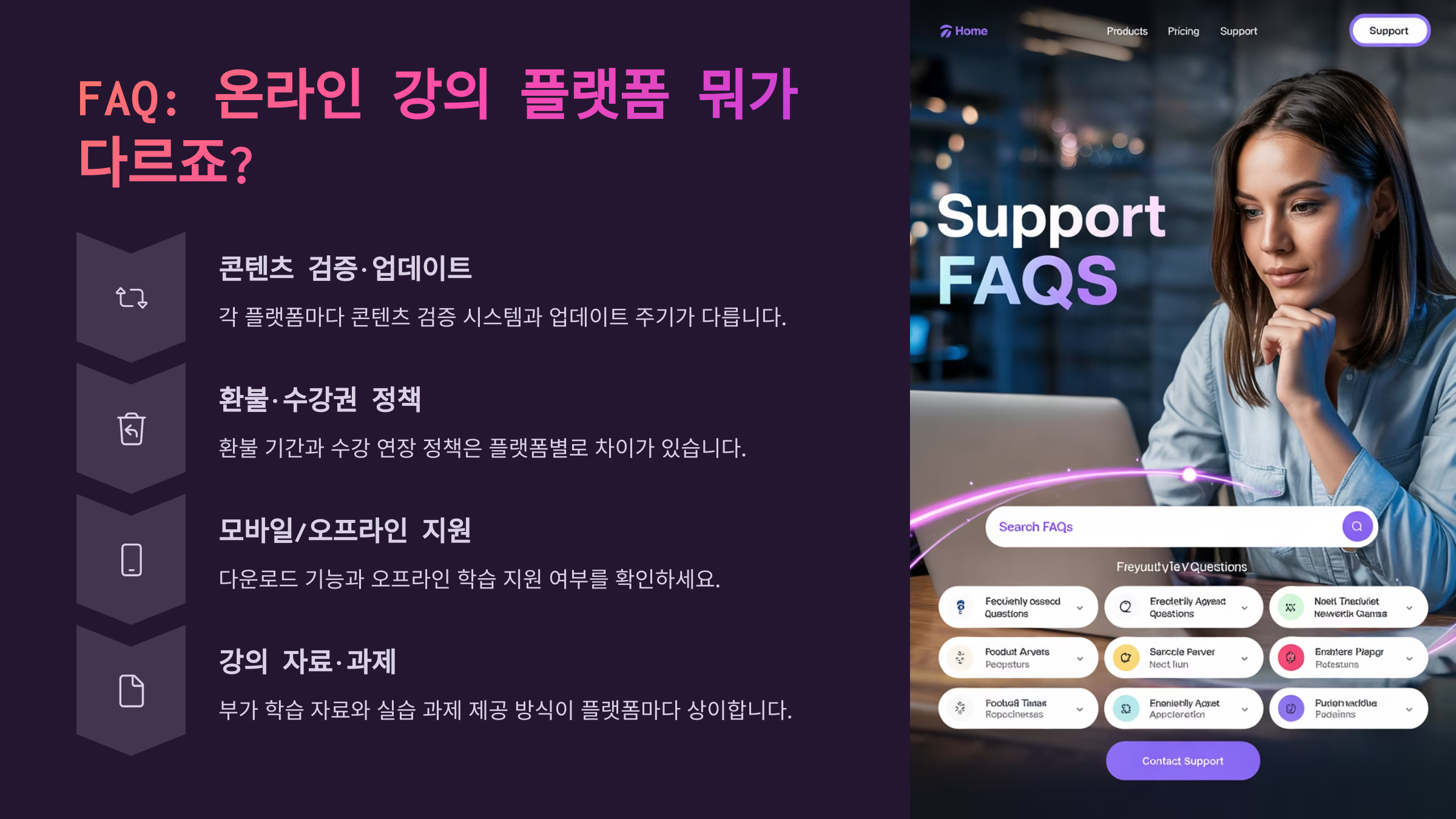A7. 온라인 강의는 커리큘럼이 체계적이고 피드백이나 자료도 훨씬 탄탄해요.