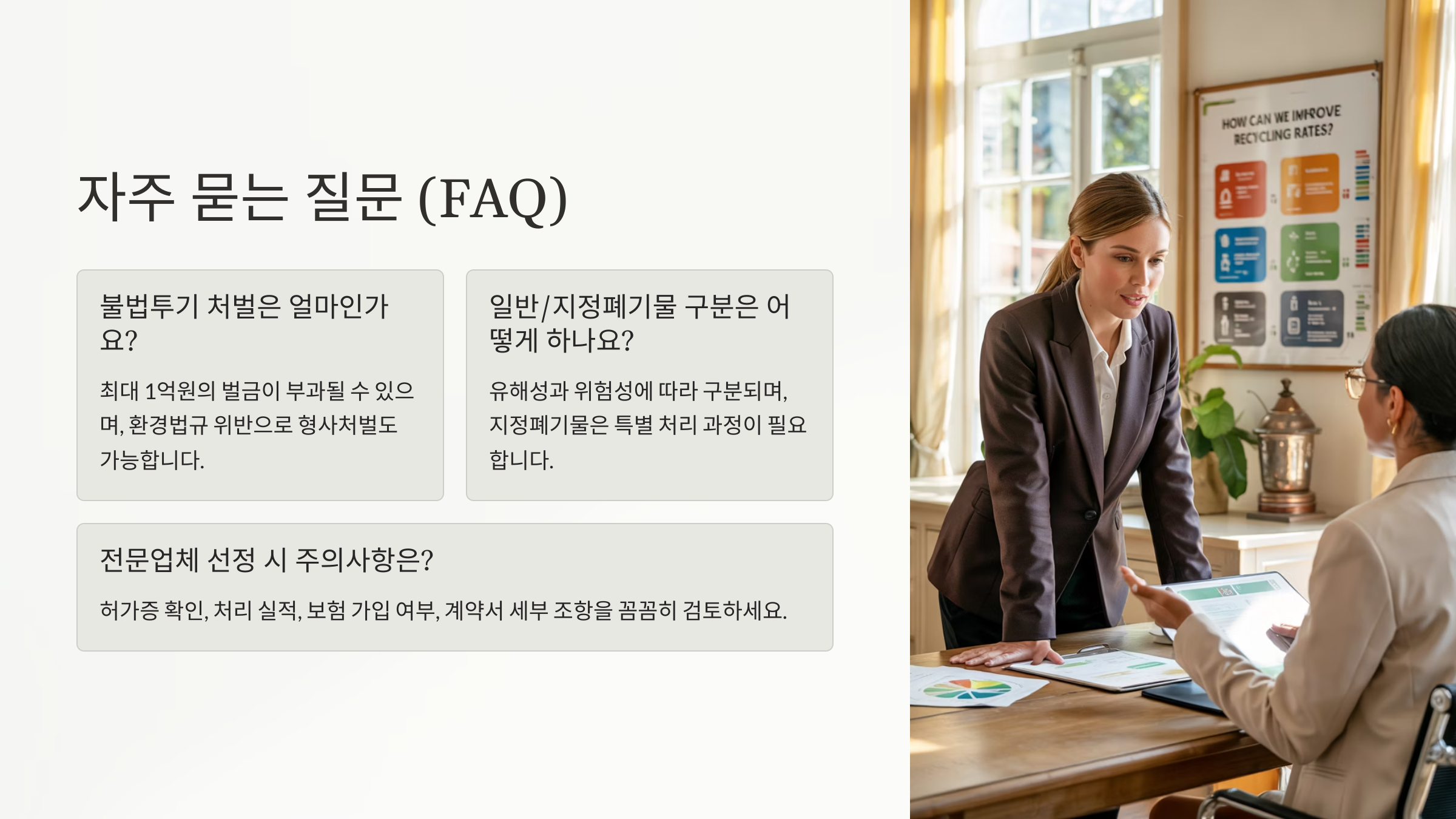 A1. 폐기물 처리에는 신고 의무가 있어서, 전문 허가업체를 통해서만 합법적으로 처리할 수 있어요. 개인이 직접 맡기면 불법으로 간주될 수 있어요! 🚫
