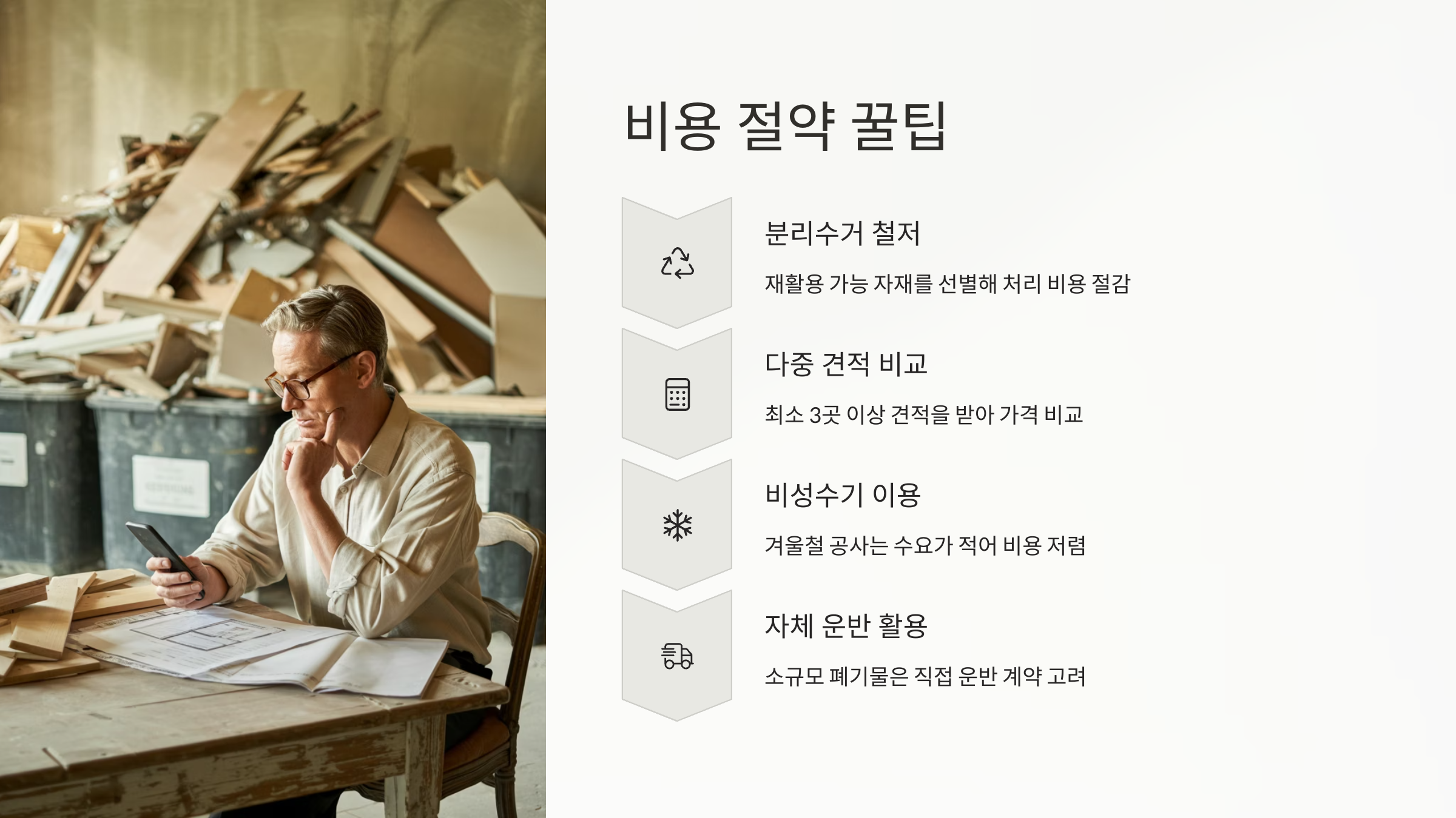 세 번째는 ‘폐기물 사전 정리’예요. 철거 후 나온 자재를 종류별로 분리해두면, 업체 입장에서도 처리하기 쉬워서 비용을 깎아주는 경우가 종종 있어요. 정리정돈만 잘해도 5~10% 할인받을 수 있답니다! 🙌