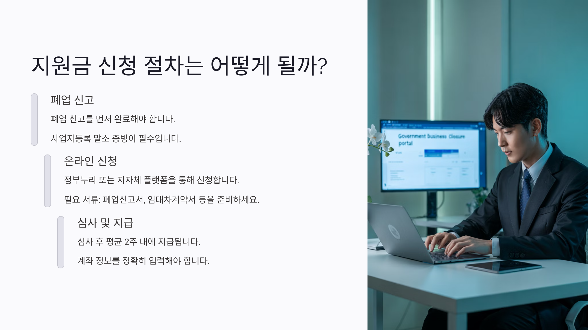지원금을 신청하는 방법은 생각보다 간단하지만, 절차를 정확히 알아두는 게 중요해요. 먼저 해야 할 일은 '폐업신고'를 완료하는 거예요. 사업자등록증을 폐업 처리하고, 국세청 홈택스에서 '폐업사실증명원'을 발급받아야 한답니다.그다음에는 소상공인시장진흥공단 누리집이나 지역센터를 통해 원하는 지원사업에 신청서를 제출하면 돼요. 요즘은 온라인으로도 간편하게 신청할 수 있어요. 필요 서류는 폐업사실증명원, 통장 사본, 사업운영 이력 등이에요.