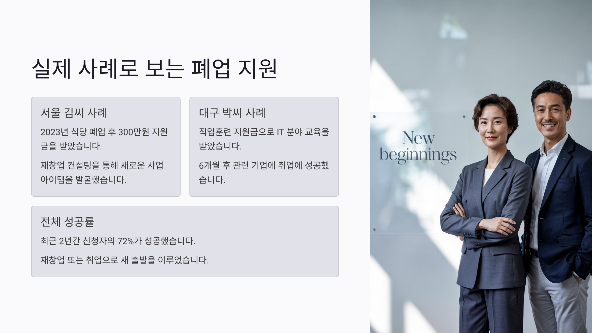 실제 사례로 보는 폐업 지원 실제 폐업 지원금 제도를 활용한 사례들을 보면, 이 제도가 단순한 ‘위로금’이 아니라는 걸 알 수 있어요. 많은 자영업자들이 폐업 후에도 새로운 길을 찾을 수 있었던 원동력이 되었거든요. 그중 대표적인 사례들을 소개할게요.