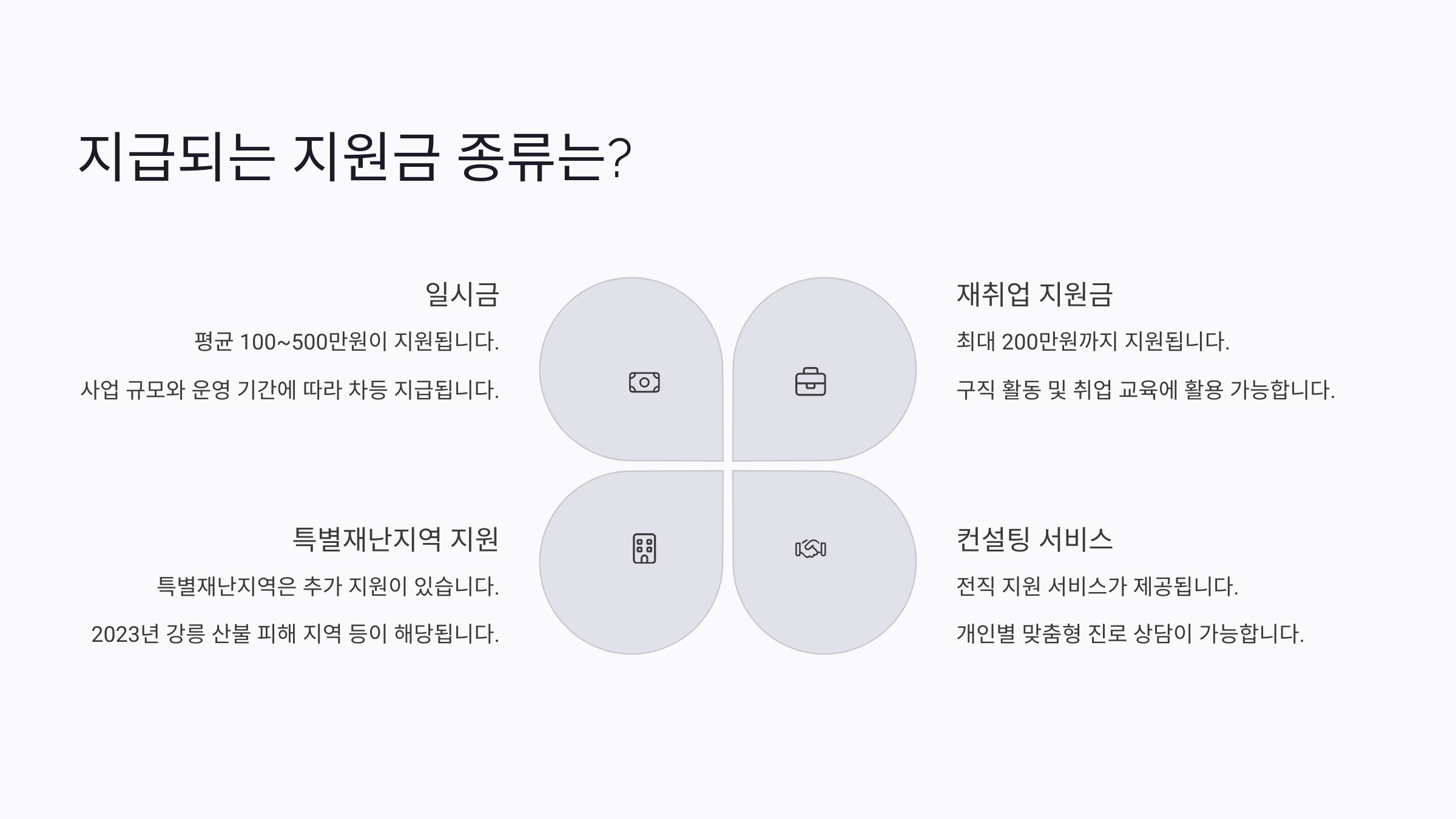 폐업 후 받을 수 있는 지원금은 한 가지가 아니에요! 상황에 따라 받을 수 있는 종류가 다양하고, 중복 신청도 가능한 경우가 있어요. 가장 대표적인 건 ‘재도전 장려금’인데, 이 외에도 ‘점포 철거 지원금’, ‘전직장려수당’, ‘폐업 소상공인 특별융자’ 등이 있어요.‘재도전 장려금’은 사업을 마무리하고 다시 도전하는 사람을 위한 기본형 지원이에요. 최대 100만원까지 정액 지급되고, 심사 기준이 비교적 단순해서 가장 많이 신청하는 형태예요. 실제로 신청자 수 기준으로 가장 인기가 많아요.