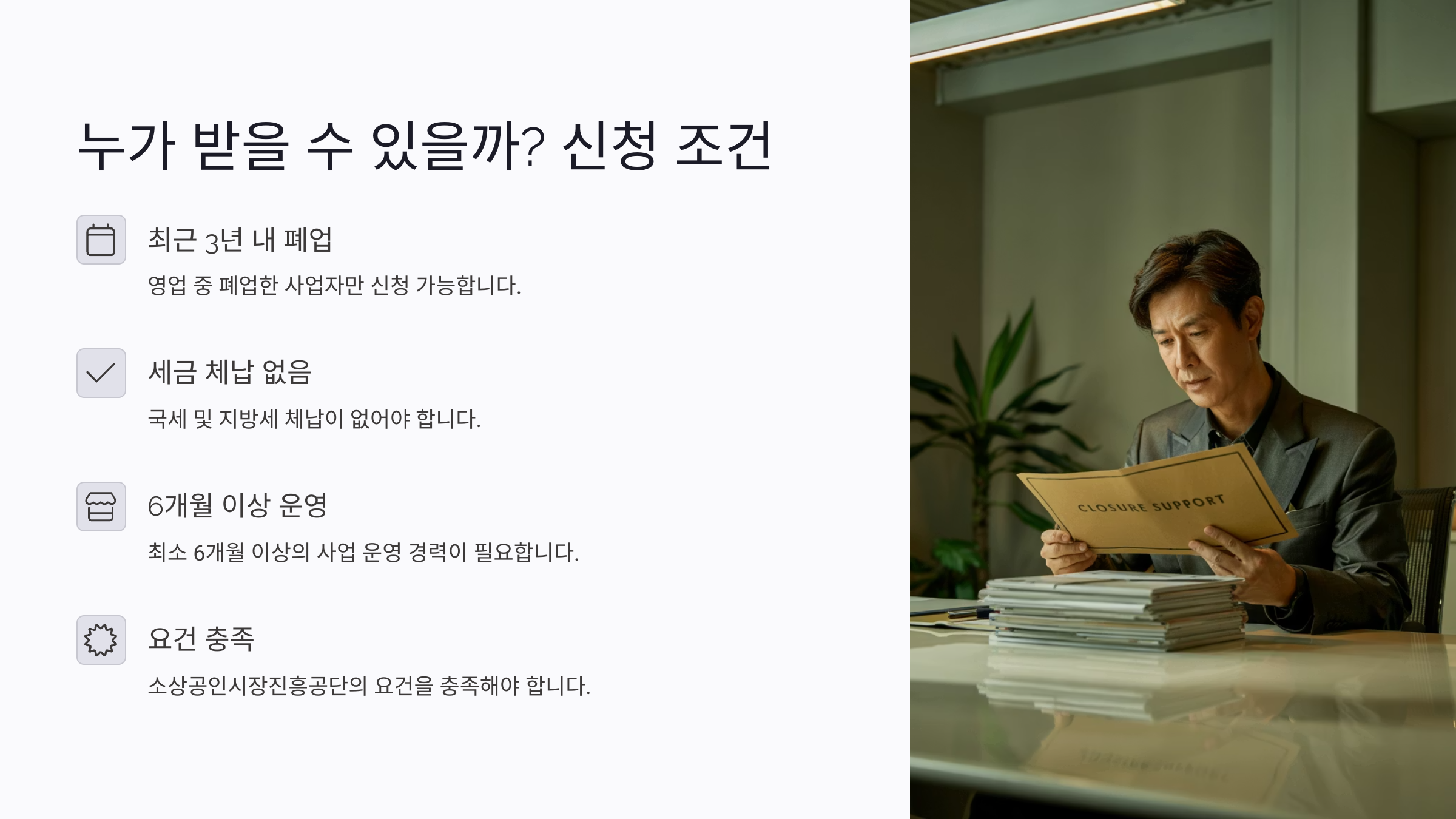 누가 받을 수 있을까? 신청 조건 폐업지원금이라고 해서 누구나 받을 수 있는 건 아니에요. 기본적으로 지원 자격을 갖춰야 하는데요, 가장 중요한 조건은 ‘자발적 폐업’이어야 해요. 즉, 정부가 지원을 원하는 대상은 사업을 포기하고 새로운 시작을 준비하는 사람인 거죠.