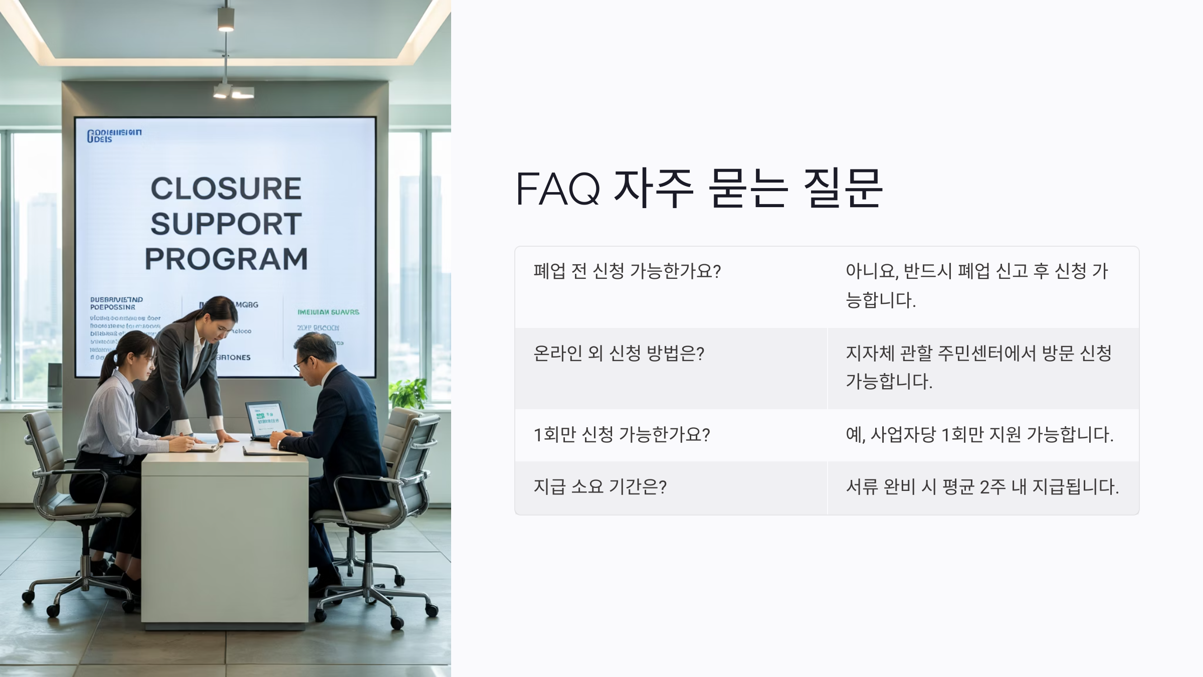 A3. 대부분의 제도는 폐업 후 신청이 가능해요. 하지만 폐업 전 미리 상담받고 서류를 준비해두는 건 매우 좋아요.