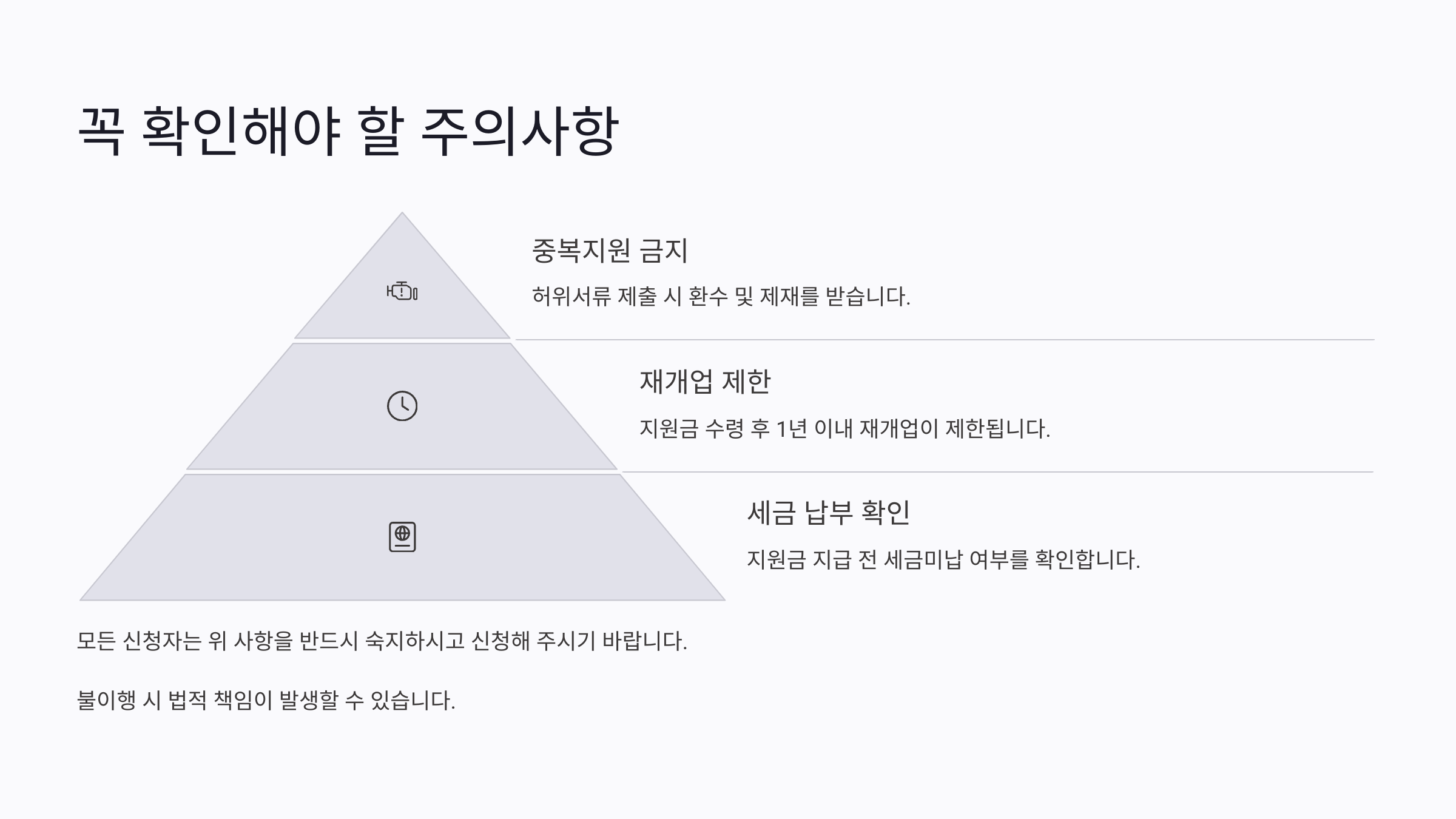 주의 항목 내용 해결 방법 신청 기한 경과 60일 이내 신청 필수 폐업과 동시에 정보 확인 중복 수급 같은 항목은 중복 불가 기존 수급 여부 확인 허위 서류 제출 법적 처벌 대상 사실에 근거한 신청 이런 사항들을 미리 알고 있으면 불이익 없이 안정적으로 지원금을 받을 수 있어요. 폐업은 아프지만, 제도의 혜택을 제대로 활용한다면 그 자체가 또 다른 시작이 될 수 있어요. 꼼꼼히 따져보고 똑똑하게 신청하세요! 💼