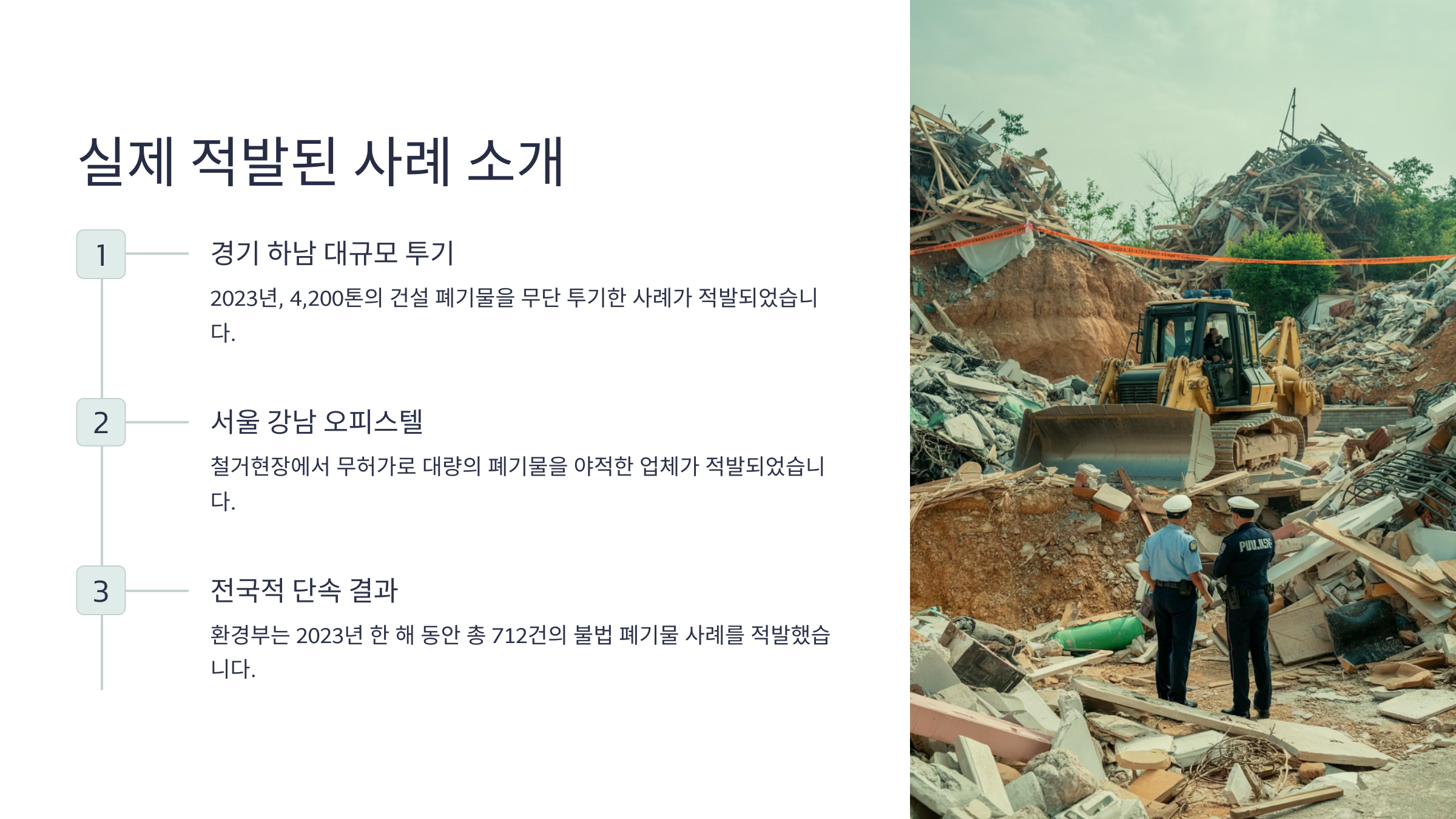 실제 적발된 사례 소개 최근 뉴스에 나온 사례 중 하나를 소개할게요. 2025년 3월, 경기도 고양시에서 한 철거 업체가 허가받지 않은 장소에 철거 폐기물을 무단 투기하다가 적발되었어요. 이 업체는 철거 과정에서 나온 콘크리트 파편과 폐목재를 인근 공터에 몰래 버리다가 시민 신고로 붙잡혔답니다.