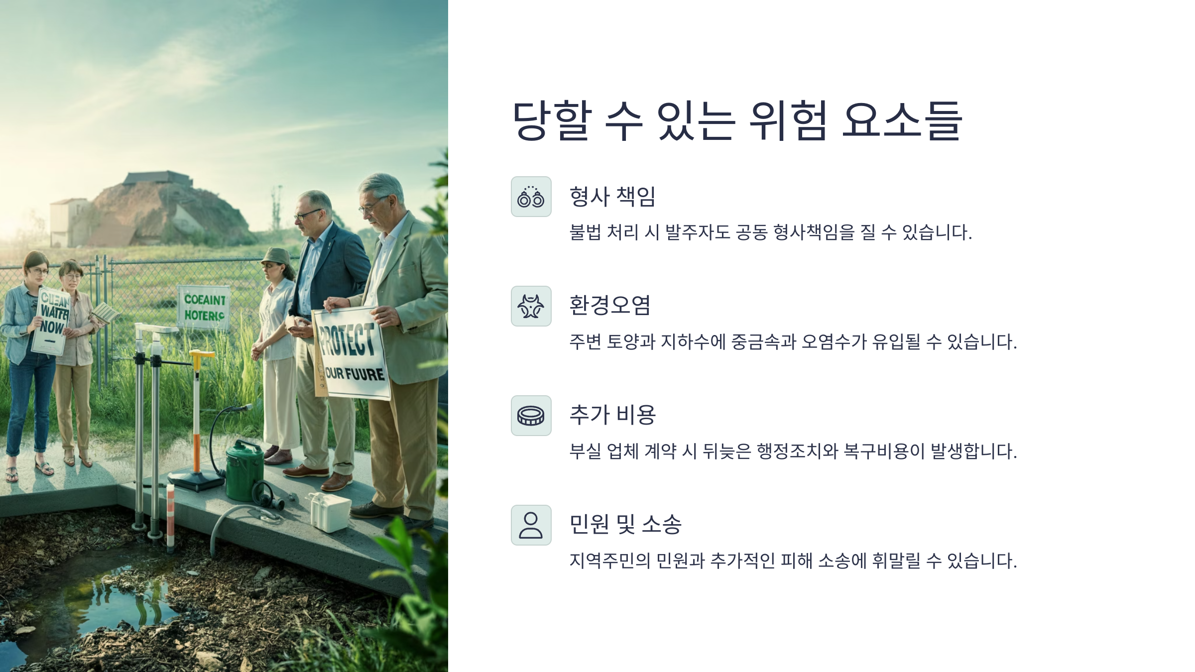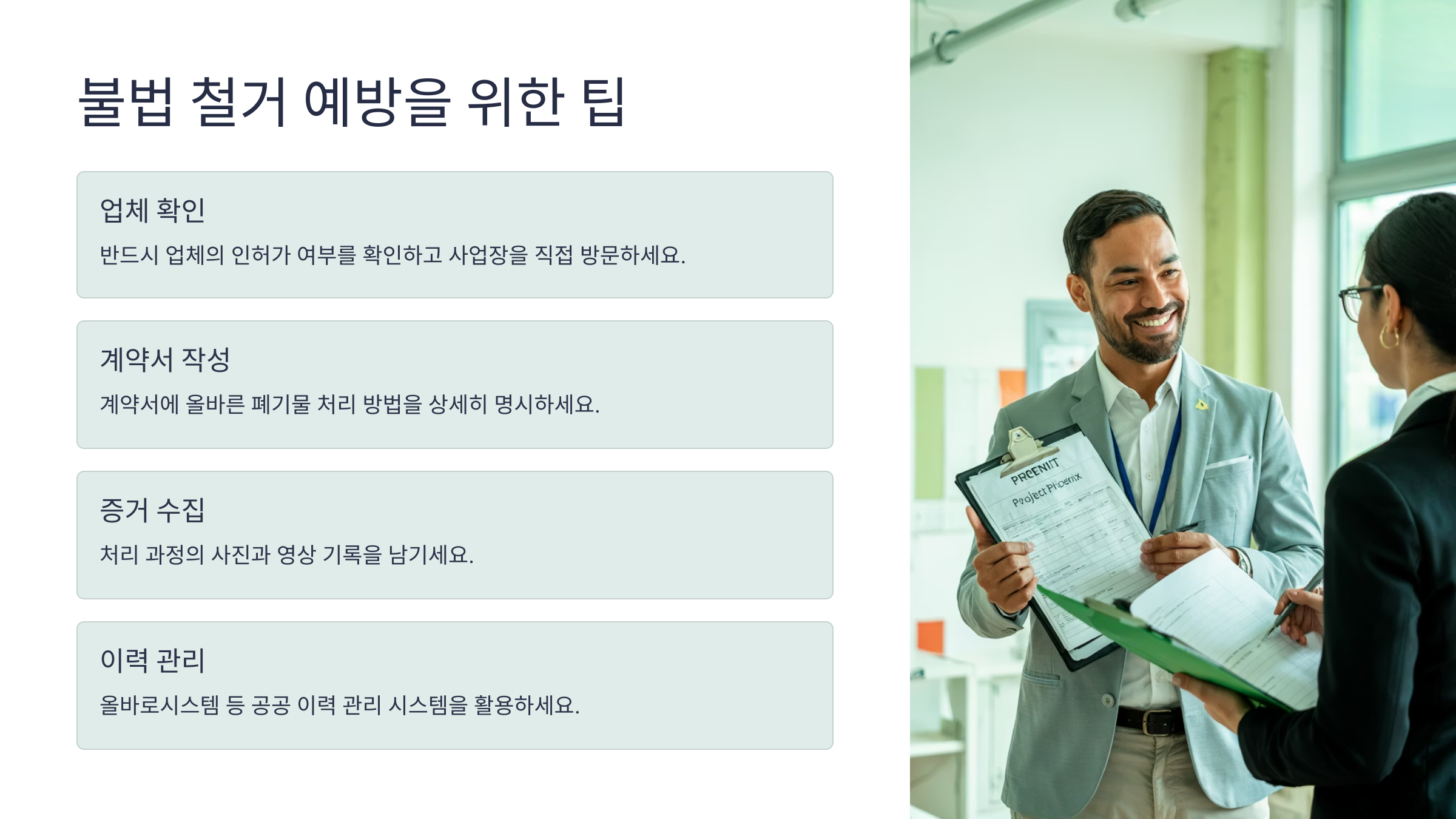 네 번째는 계약 부주의예요. 구두로만 약속하고, 실제로 문서에 남기지 않으면 책임 소재가 모호해져요. 계약서에 반드시 ‘적법한 폐기물 처리 의무’ 조항을 넣는 게 필요해요.