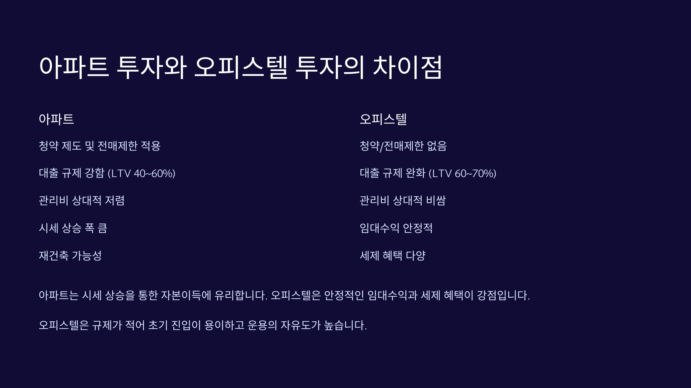 많은 사람들이 오피스텔과 아파트 투자를 고민하면서 "뭐가 더 나을까?" 하고 비교하게 돼요. 사실 두 상품은 구조적으로 완전히 다른 시장이에요. 오피스텔은 월세 수익 중심, 아파트는 시세차익 중심이라는 게 가장 큰 차이에요.아파트는 대출, 청약, 양도세 규제 등에서 민감하게 반응하는 상품이고, 실수요자의 수요가 많아요. 반면, 오피스텔은 규제가 적은 대신 수익률이 낮을 수 있고, 공실 리스크도 존재해요.