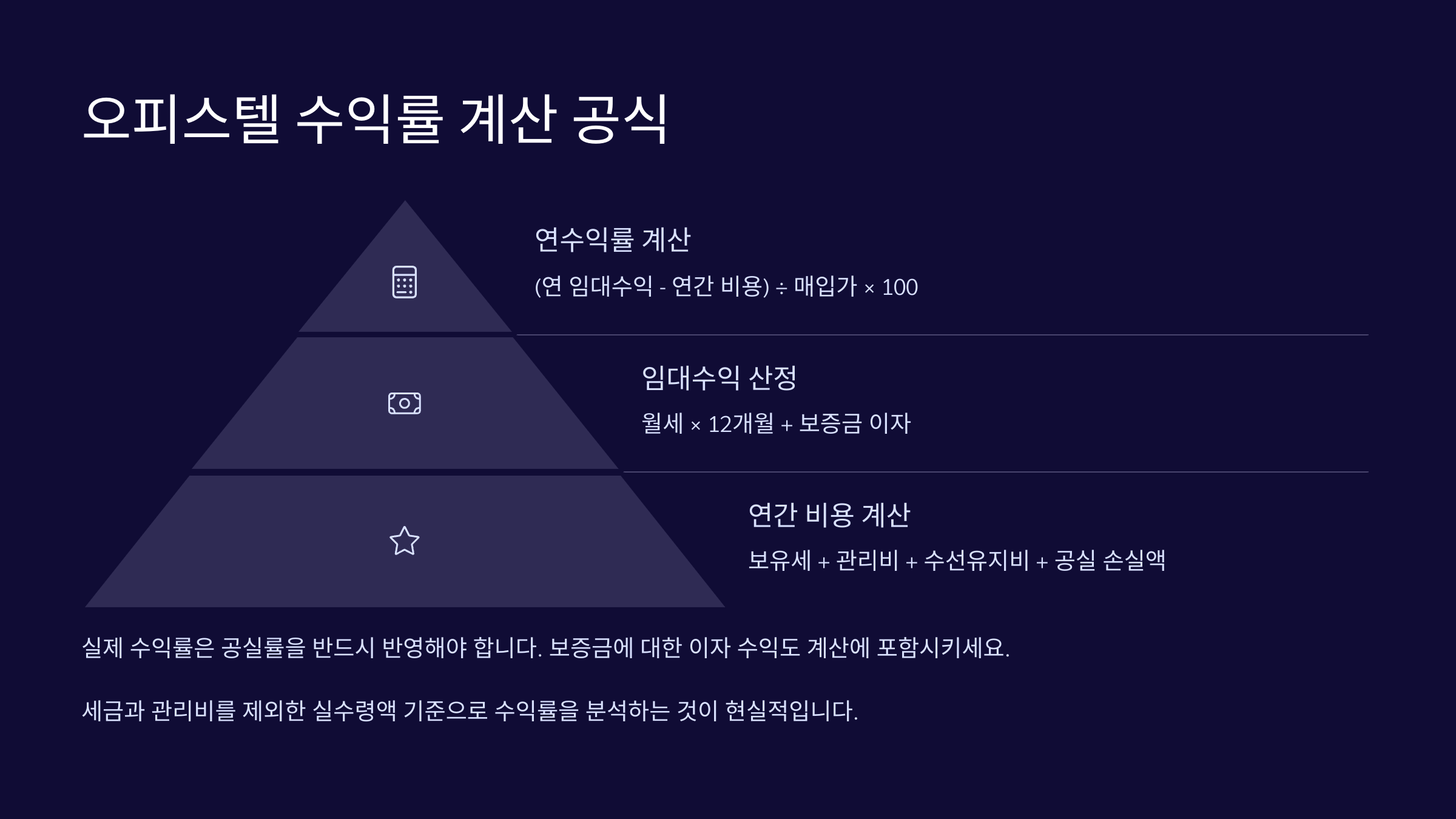 오피스텔 투자에서 가장 중요한 건 바로 ‘수익률’이에요. 단순히 매매 가격과 월세만 보는 게 아니라, 여러 요소를 고려해야 정확한 수익률 계산이 가능하죠.기본적인 계산 공식은 다음과 같아요: