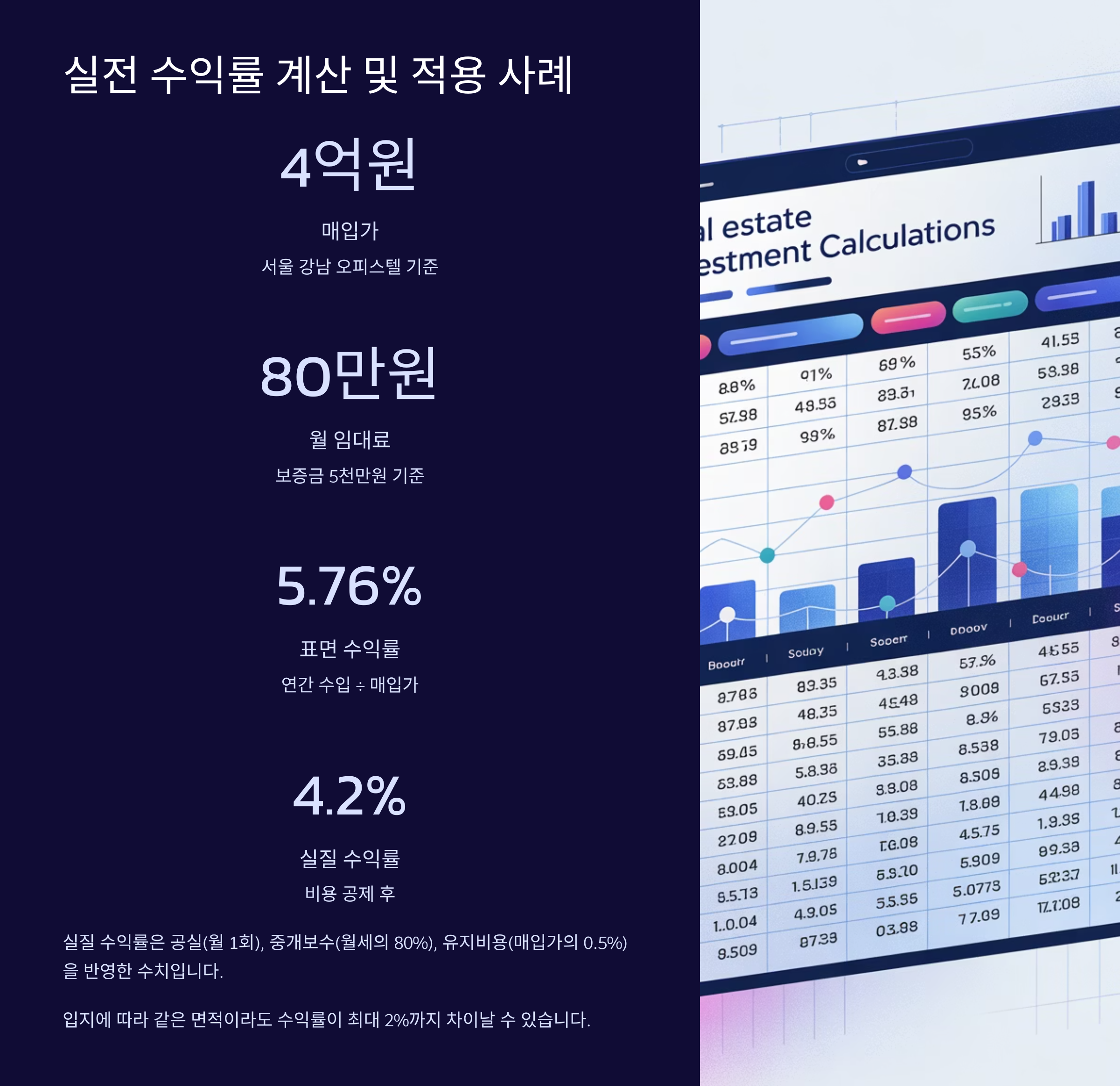 연 수익률 = (연 임대 수익 / 총 투자금액) × 100여기서 '총 투자금액'은 매매가, 취등록세, 중개수수료, 인테리어 비용 등 초기 투자비용 전부를 포함해야 해요.예를 들어, 2억 원짜리 오피스텔을 구입하고 월 80만 원에 임대한다면, 연 임대 수익은 960만 원이겠죠. 여기에 초기비용이 2,200만 원 정도 들었다면 총 투자금은 2억 2천만 원. 수익률은 (960 / 22000) × 100 = 약 4.36%가 나와요.