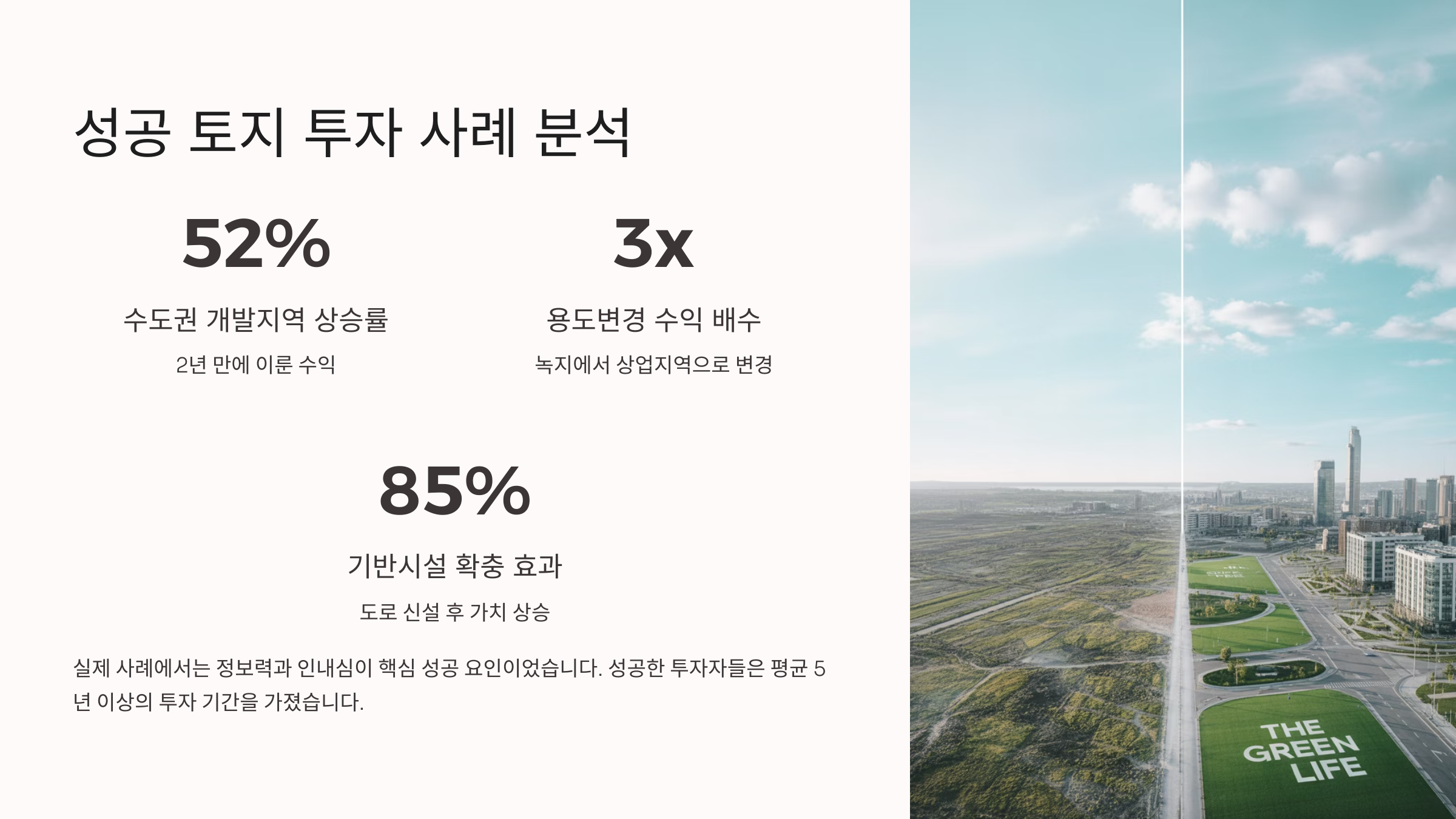 성공 사례 대부분은 ‘정보력’과 ‘입지 분석’에 기반해요. 즉흥적인 투자가 아니라, 도시계획 확인과 직접 답사, 전문가 자문을 받은 경우가 많죠.