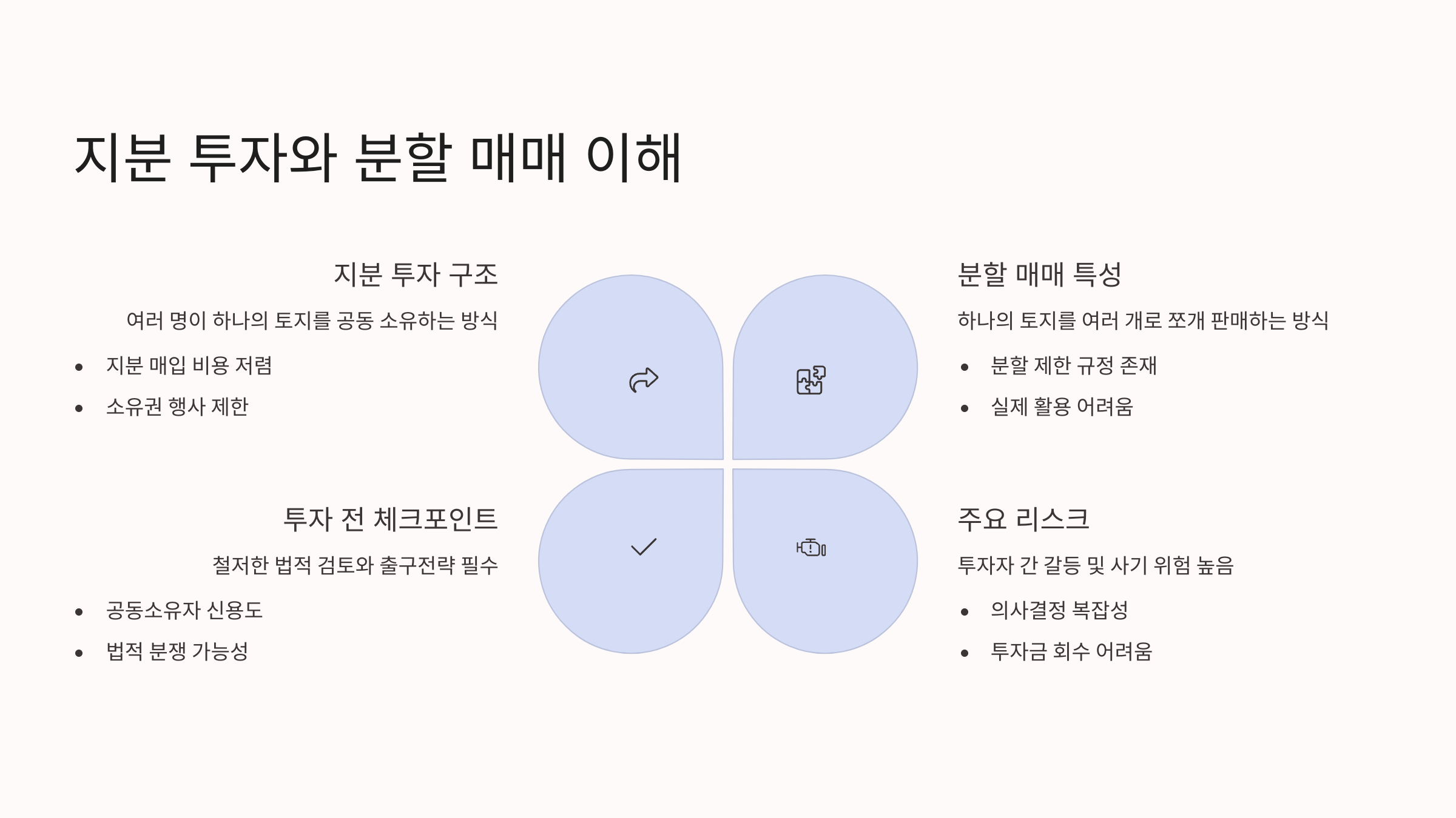 하지만 주의할 점도 있어요. 지분 투자는 사용권 분쟁이 발생할 수 있고, 일부 지자체는 ‘쪼개기 매매’ 규제를 강화했기 때문에 반드시 법률 검토와 전문가 상담이 필요해요.