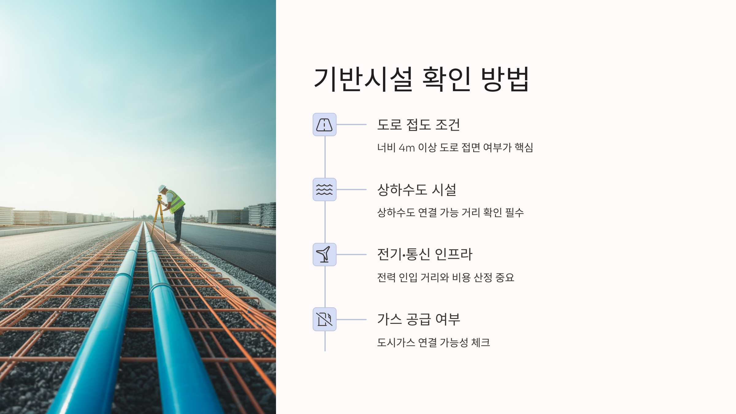 또한, 상하수도, 가스, 전기 등의 인입 여부도 확인해야 해요. 지자체 시설과 연결되지 않으면 막대한 인프라 공사 비용이 들어가요.