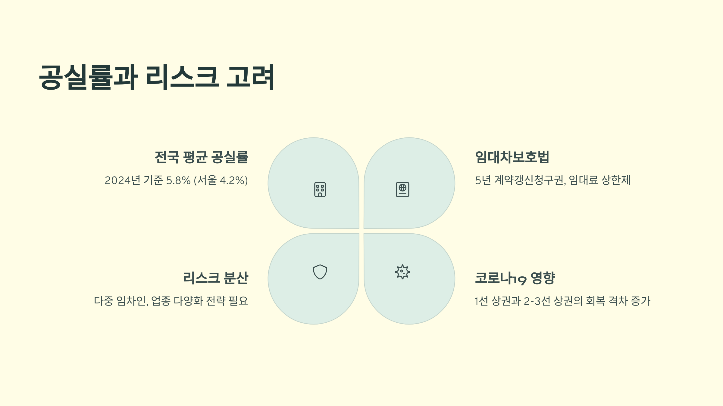 상가는 주택과 달리 '임차인 리스크'가 크고, 공실이 생기면 바로 수익이 제로가 돼요. 따라서 정확한 수익률 계산은 필수이고, 입지 분석과 업종 특성 파악도 함께해야 해요.