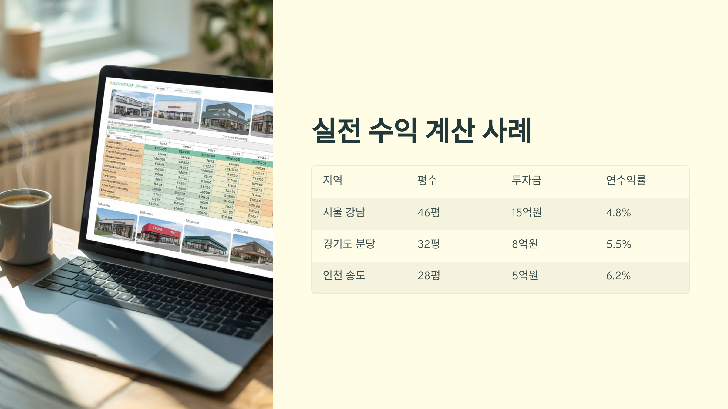 서울 마포구 합정역 인근 1층 상가를 예로 들어볼게요. - 매입가: 6억 원 - 월 임대료: 250만 원 (연 3,000만 원) - 연 관리비·세금: 500만 원 - 총 투자금: 6.5억 원 (취득세 포함)연 수익: 3,000 - 500 = 2,500만 원 → 수익률: (2,500 ÷ 65,000) × 100 = 약 3.84%