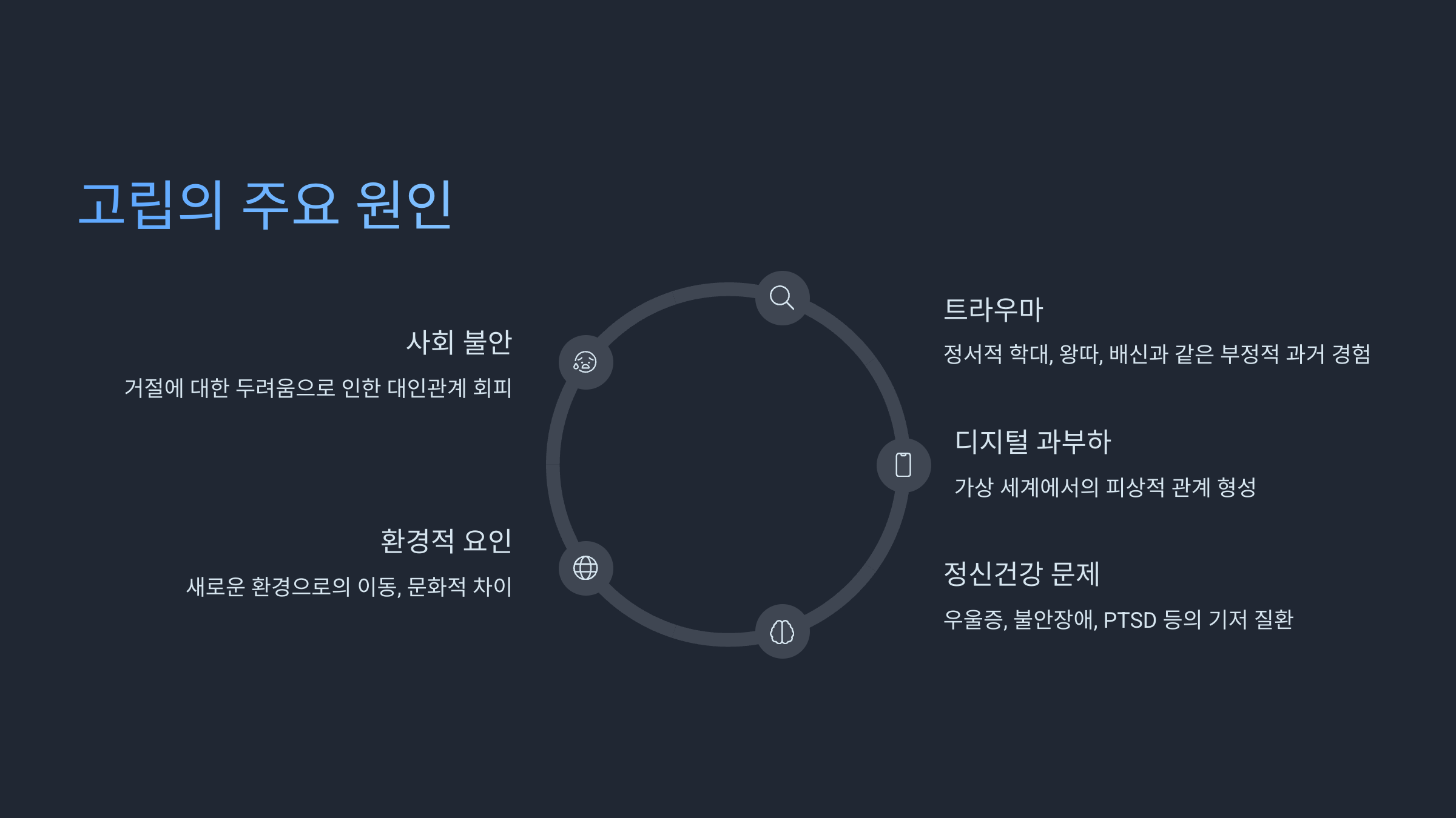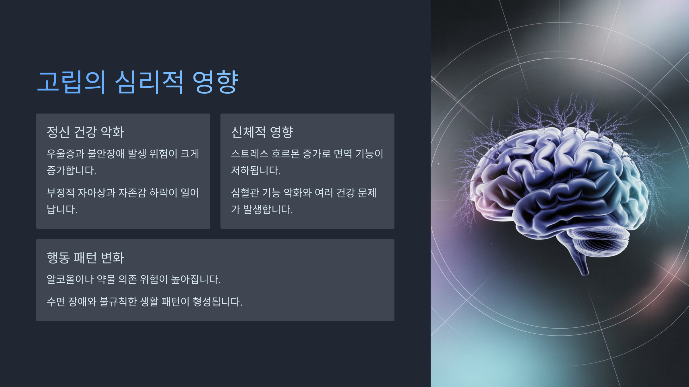 고립의 이유는 정말 다양해요. 누군가는 심한 스트레스와 사회적 압박을 견디지 못하고 스스로 문을 닫았고, 또 다른 사람은 외부의 사건, 예를 들어 실직이나 상실 같은 일로 사회에서 멀어지게 돼요. 고립은 단순히 물리적 공간에서 떨어진 게 아니라, 심리적으로도 세상과의 연결을 끊어낸 상태예요.
